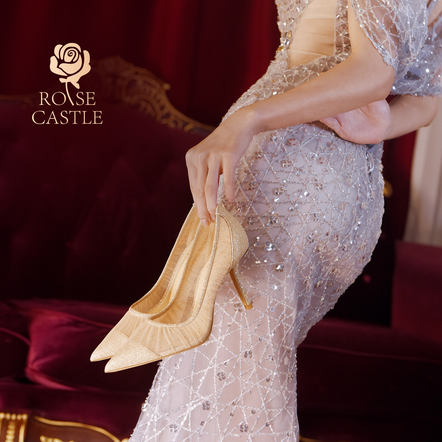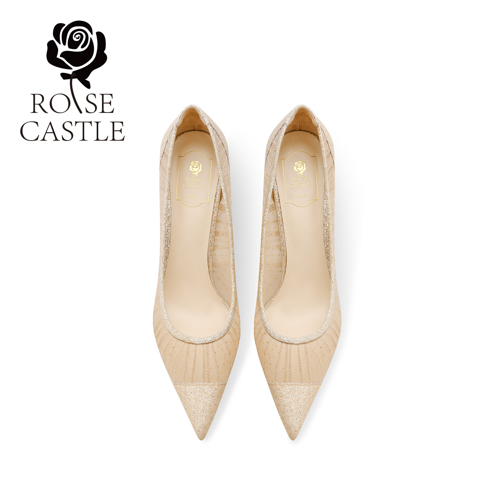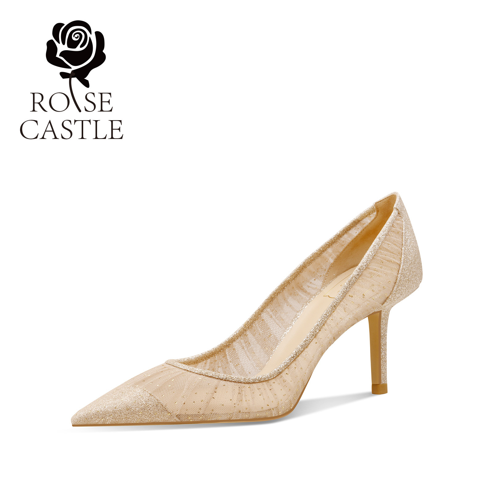 rosecastle 金色婚鞋女新娘鞋简约气质宴会高跟鞋蕾丝礼服单鞋