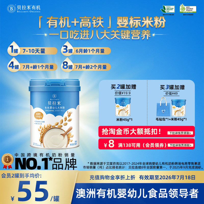 贝拉米高铁有机米粉婴儿铁锌钙维c罐装辅食胡萝卜宝宝营养