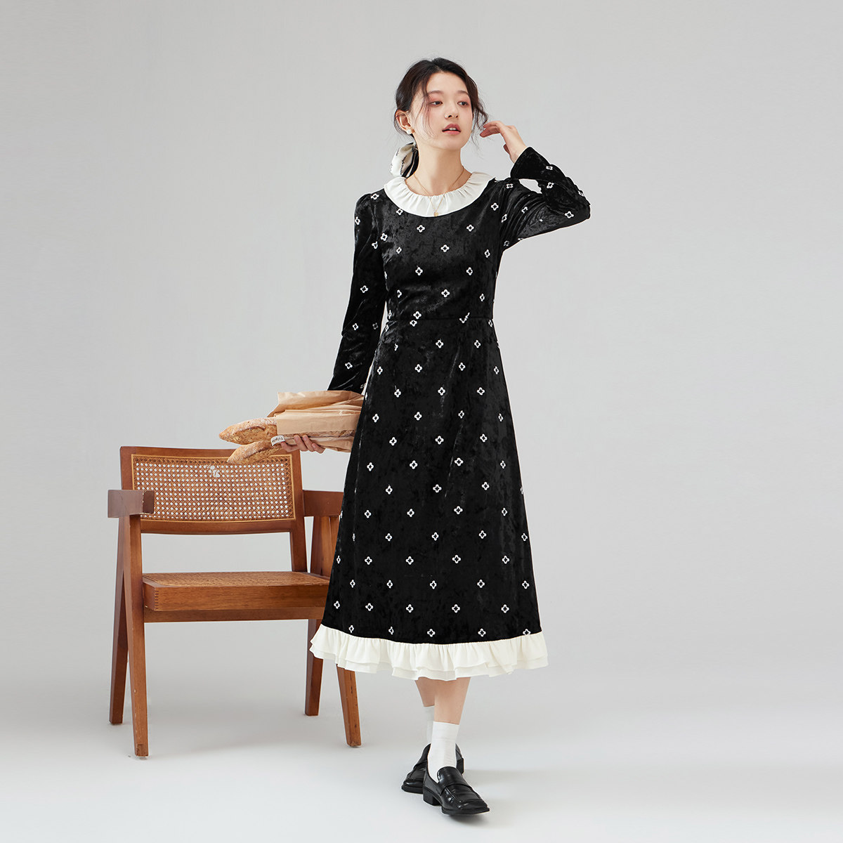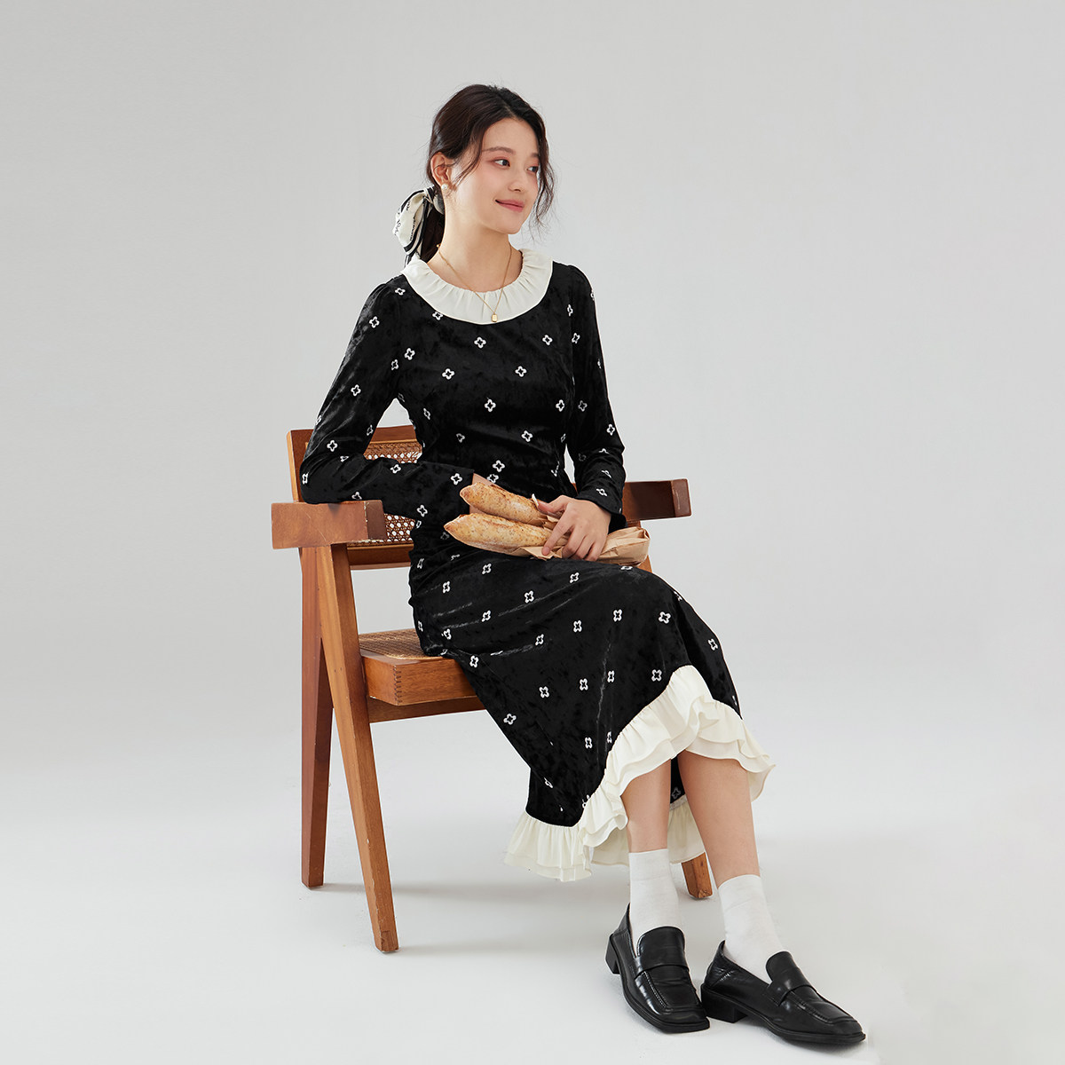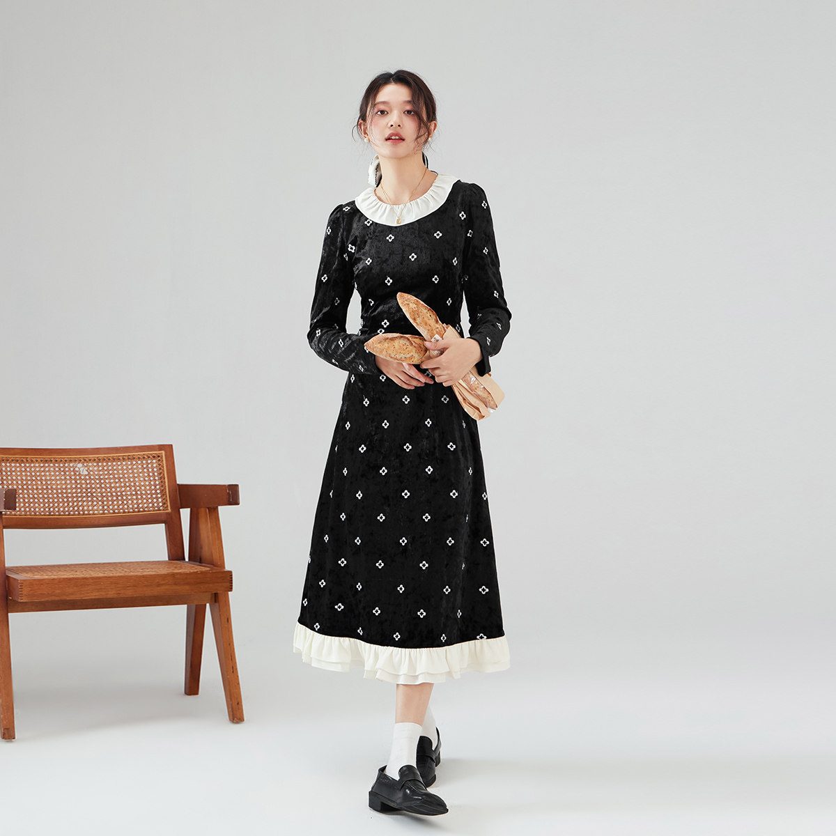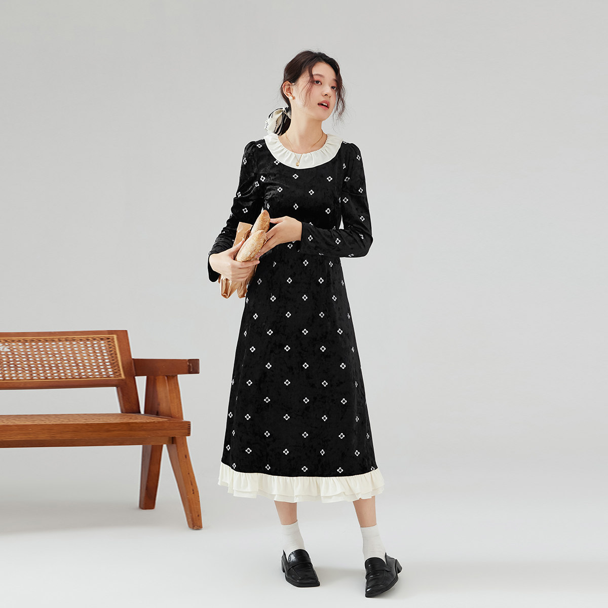 one more2025秋冬外穿拼接圆领连衣裙女高级感法式荷叶边碎花裙子