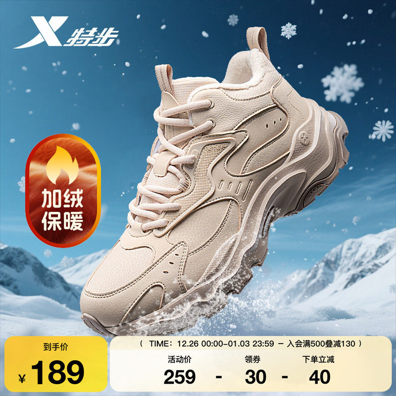特步星火休闲鞋男鞋冬季革面轻便百搭厚底增高女鞋革网正品运动鞋