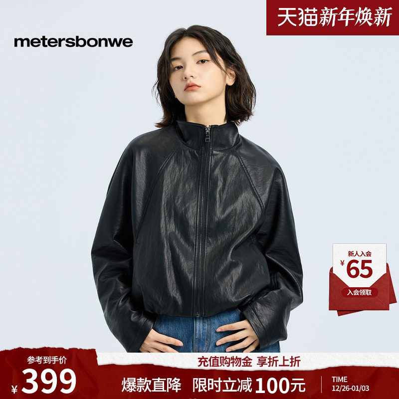 美特斯邦威夹克女士2025秋冬新款潮流PU宽松立领短款开衫机车外套