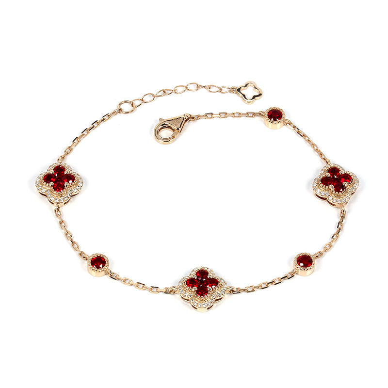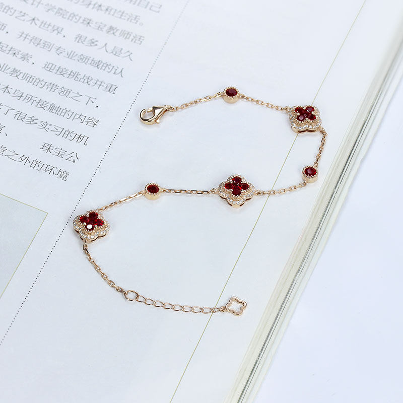 翡宝丽18K玫瑰金天然鸽血红宝石幸运四叶草手链 正红钻石可调节女