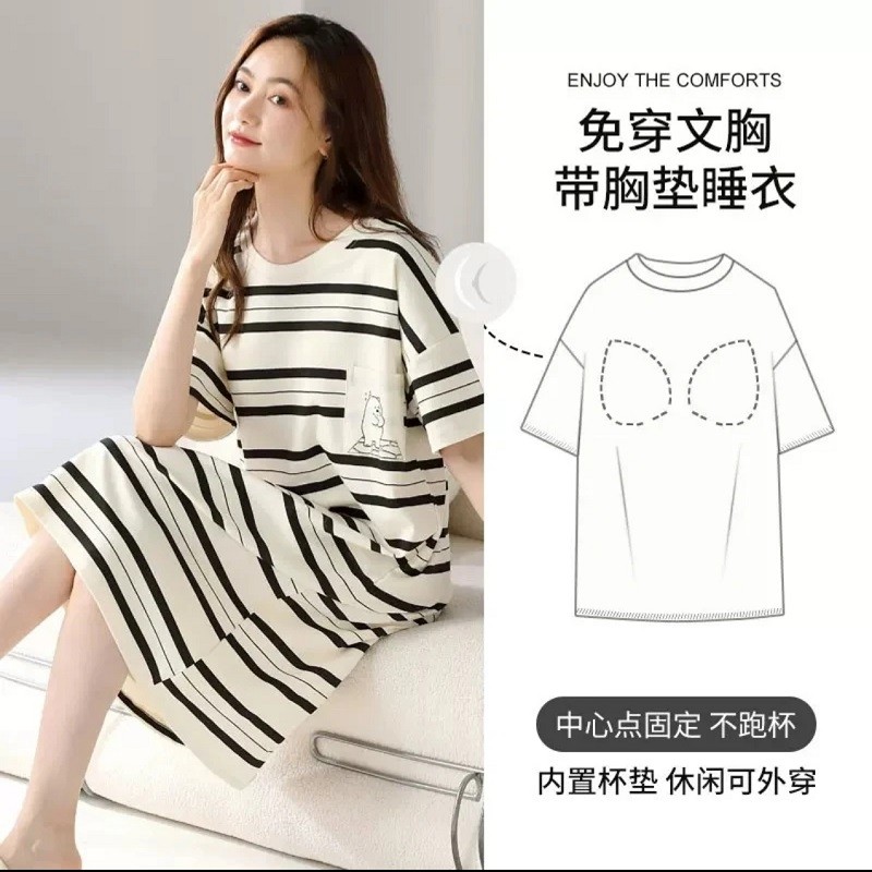 防走光带胸垫睡裙女款夏季宽松短袖睡衣可外穿2024新款韩式中长裙