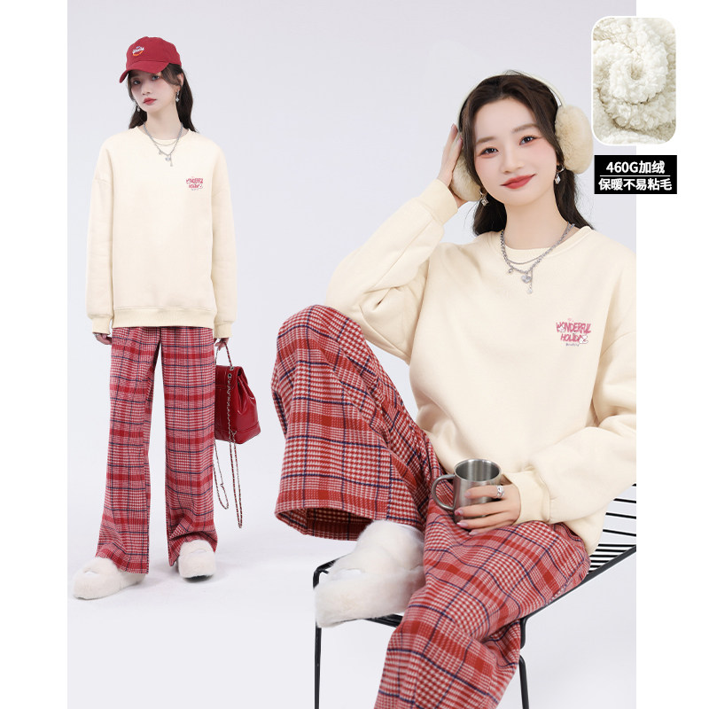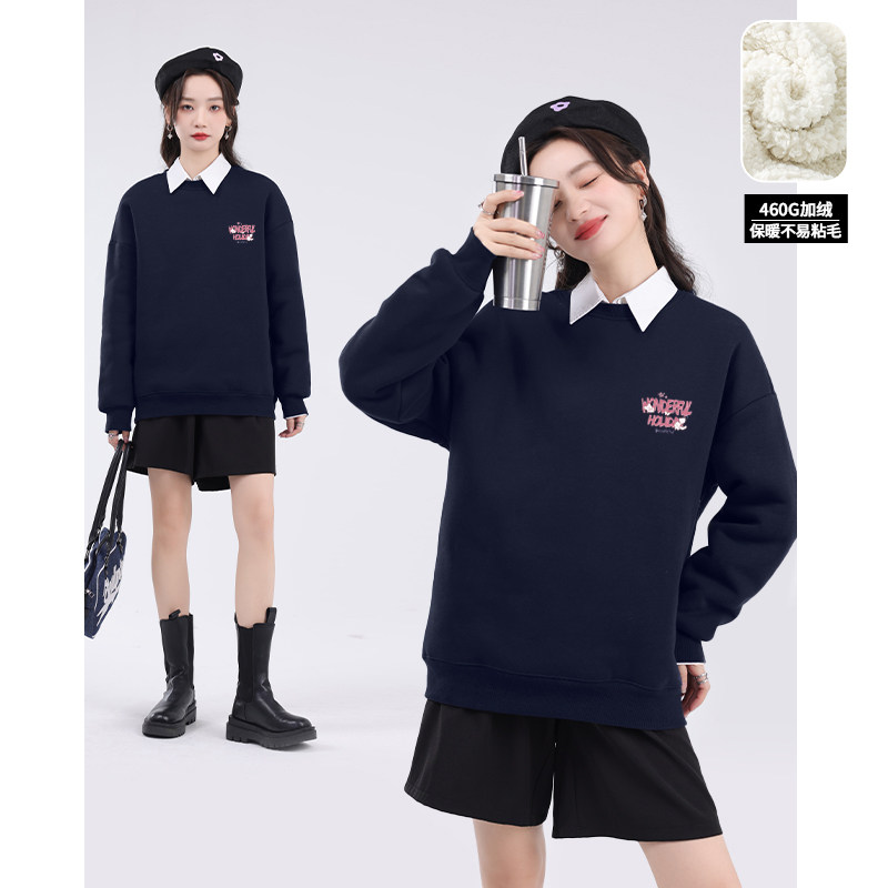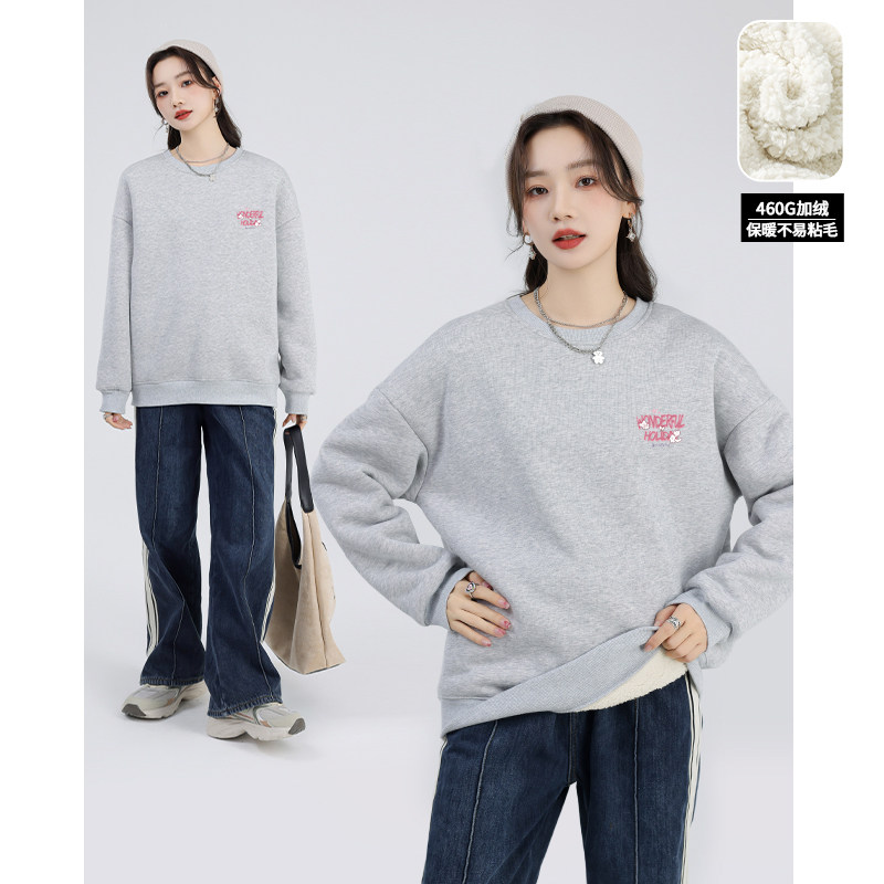 宽松显瘦圆领卫衣女2024年秋冬新品长袖套头粉色印花上衣加绒加厚