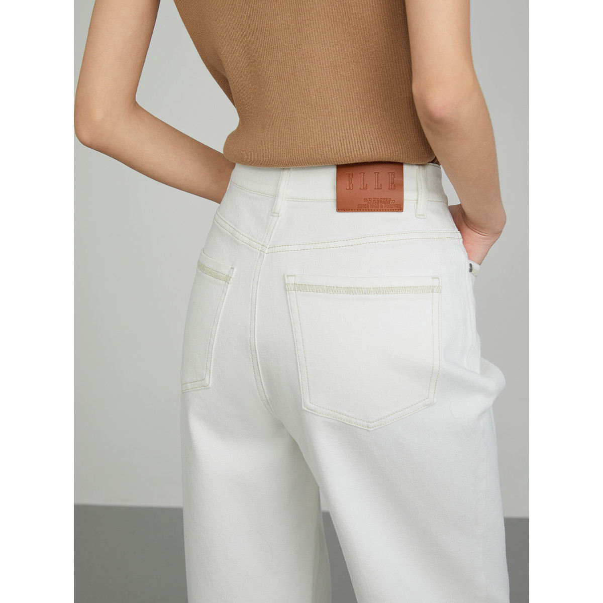ELLE米白色高腰直筒牛仔裤女2025秋新款小个子宽松休闲显瘦哈伦裤