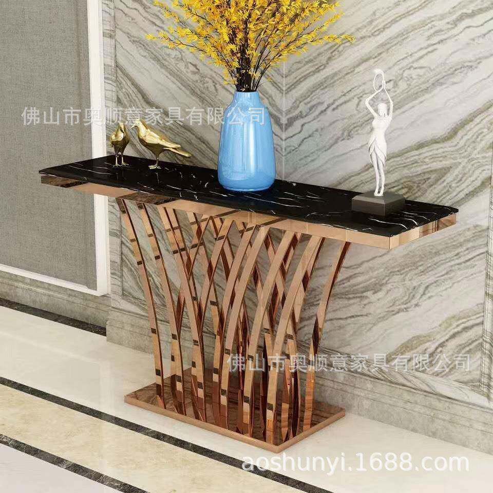 轻奢不锈钢镂空家具玄关台简约玄关柜现代大理石玄关桌子金色案台