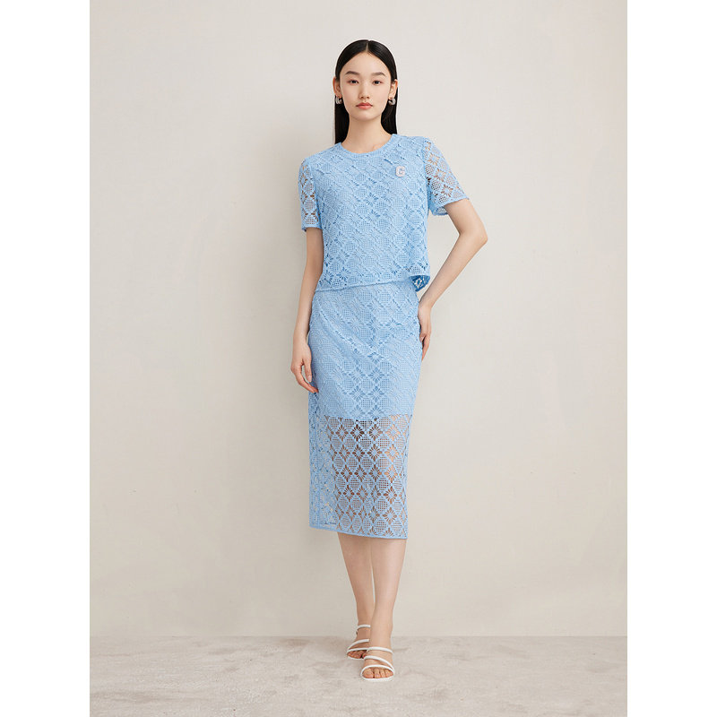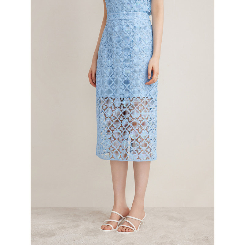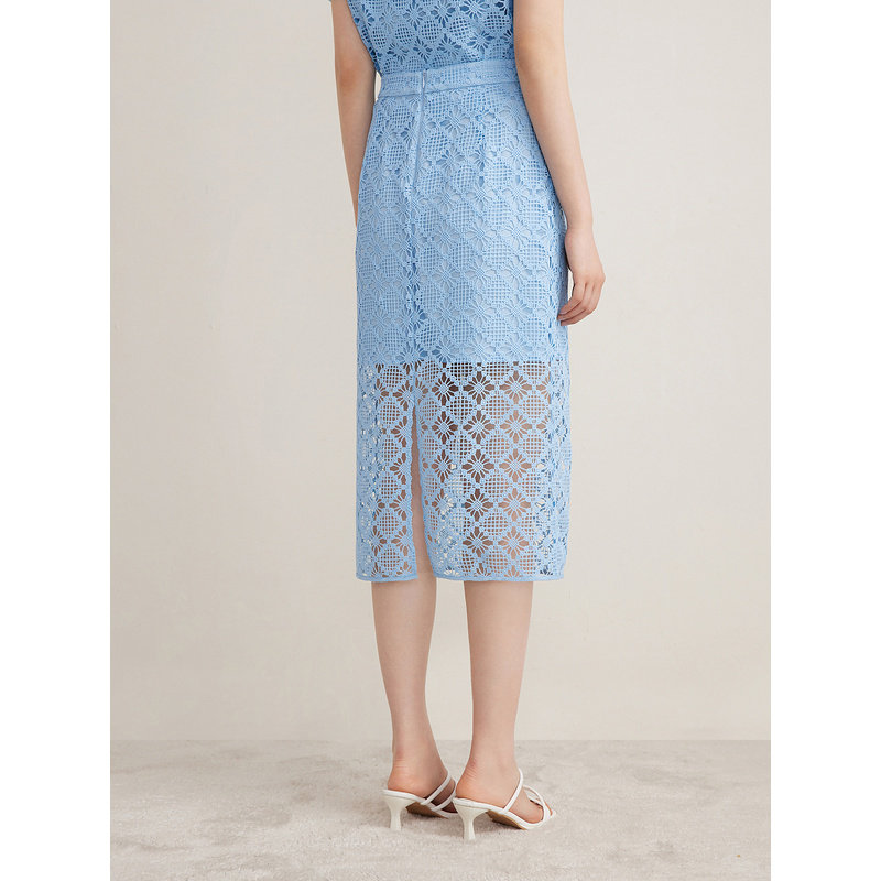 Goodland美地夏季修身直筒钩花蕾丝开衩半身裙