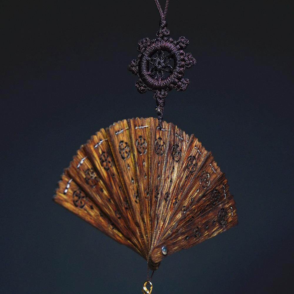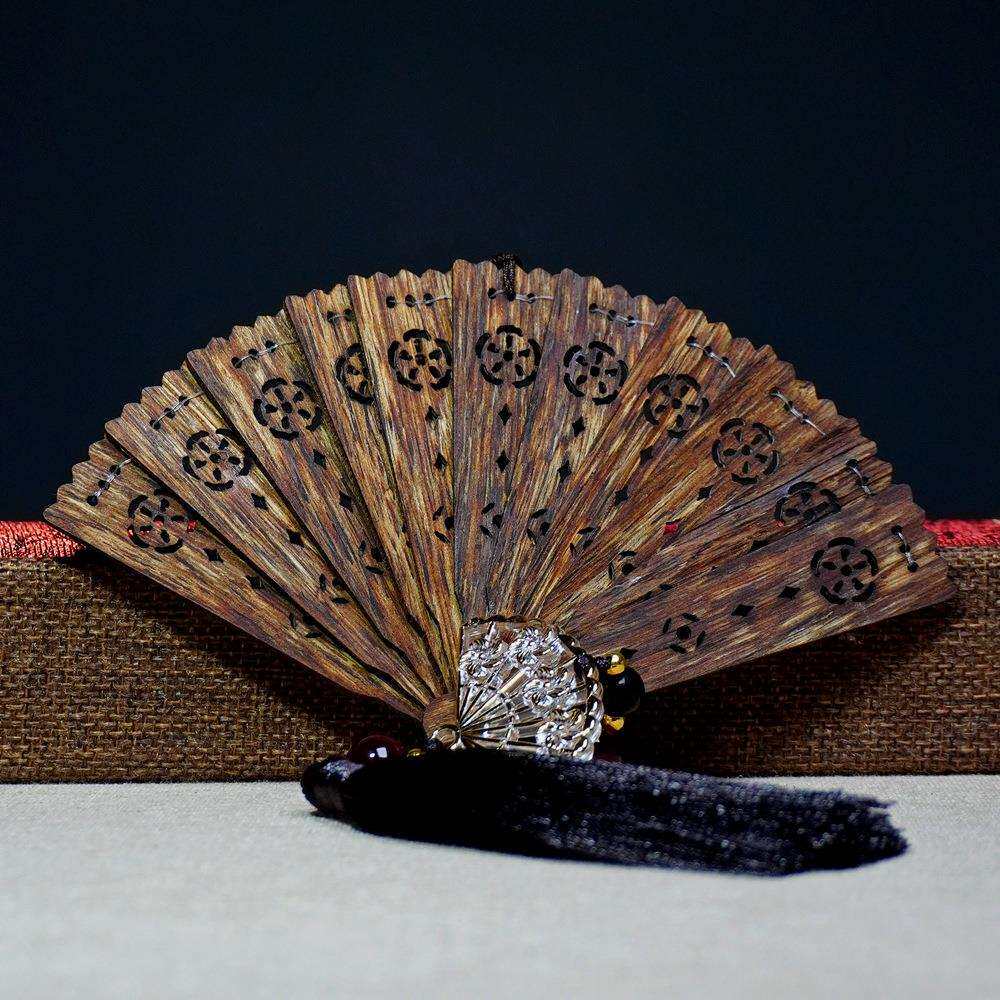 越南芽庄黑油老料沉香扇古风古典工艺品摆件复古天然沉香折扇挂坠