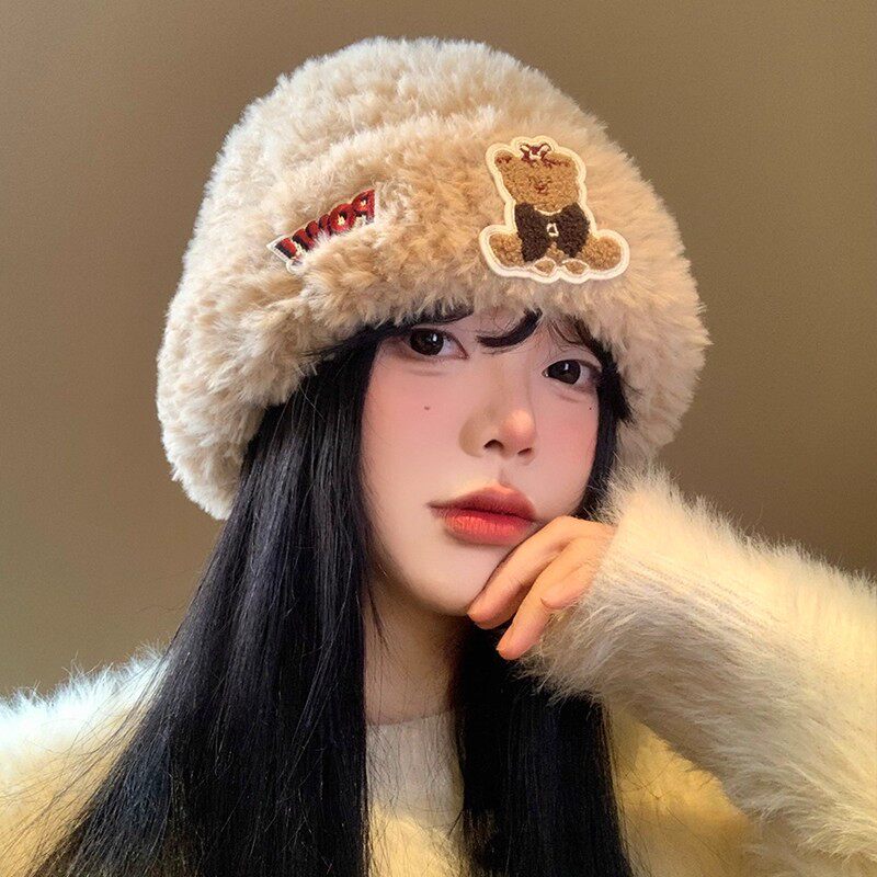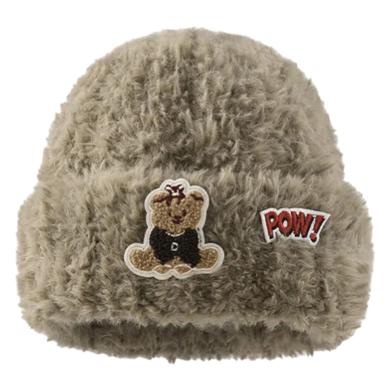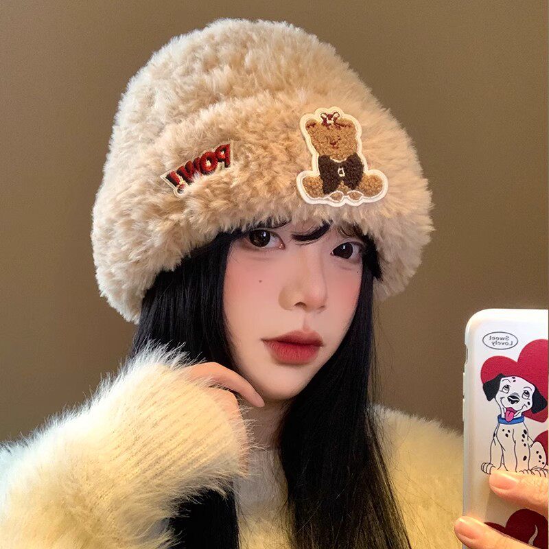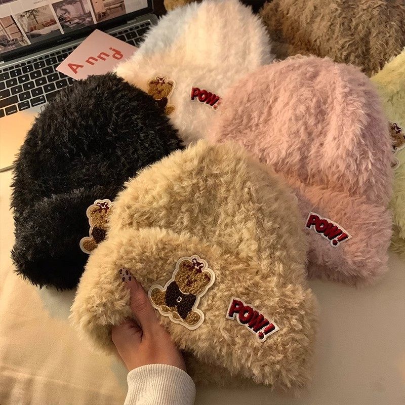 可爱小熊毛绒帽子女秋冬季保暖护耳套头冷帽加厚毛线显脸小针织帽