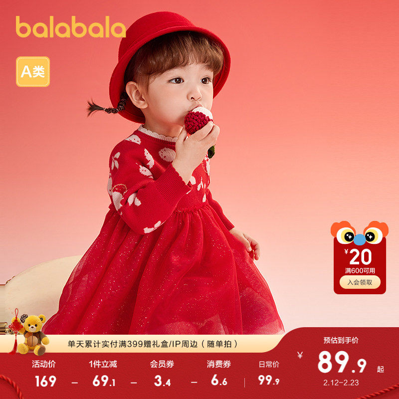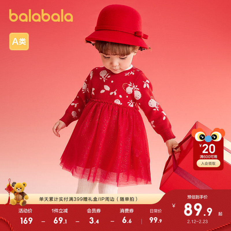 巴拉巴拉童装婴儿女童连衣裙2025春秋新款红色拜年服甜美针织裙子