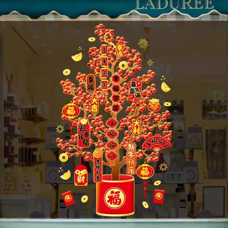 2026新年过年装饰发财树窗花贴福字门贴玻璃贴纸马年过年喜庆贴纸