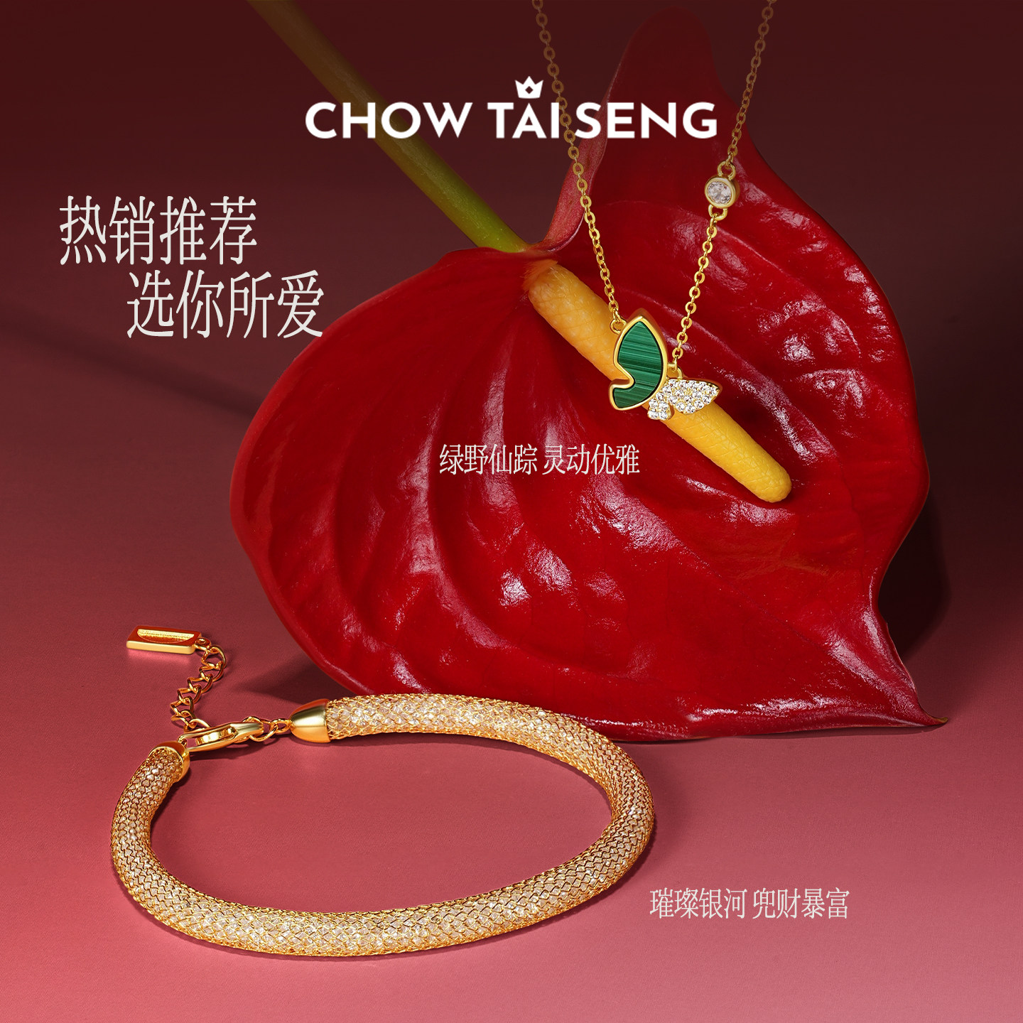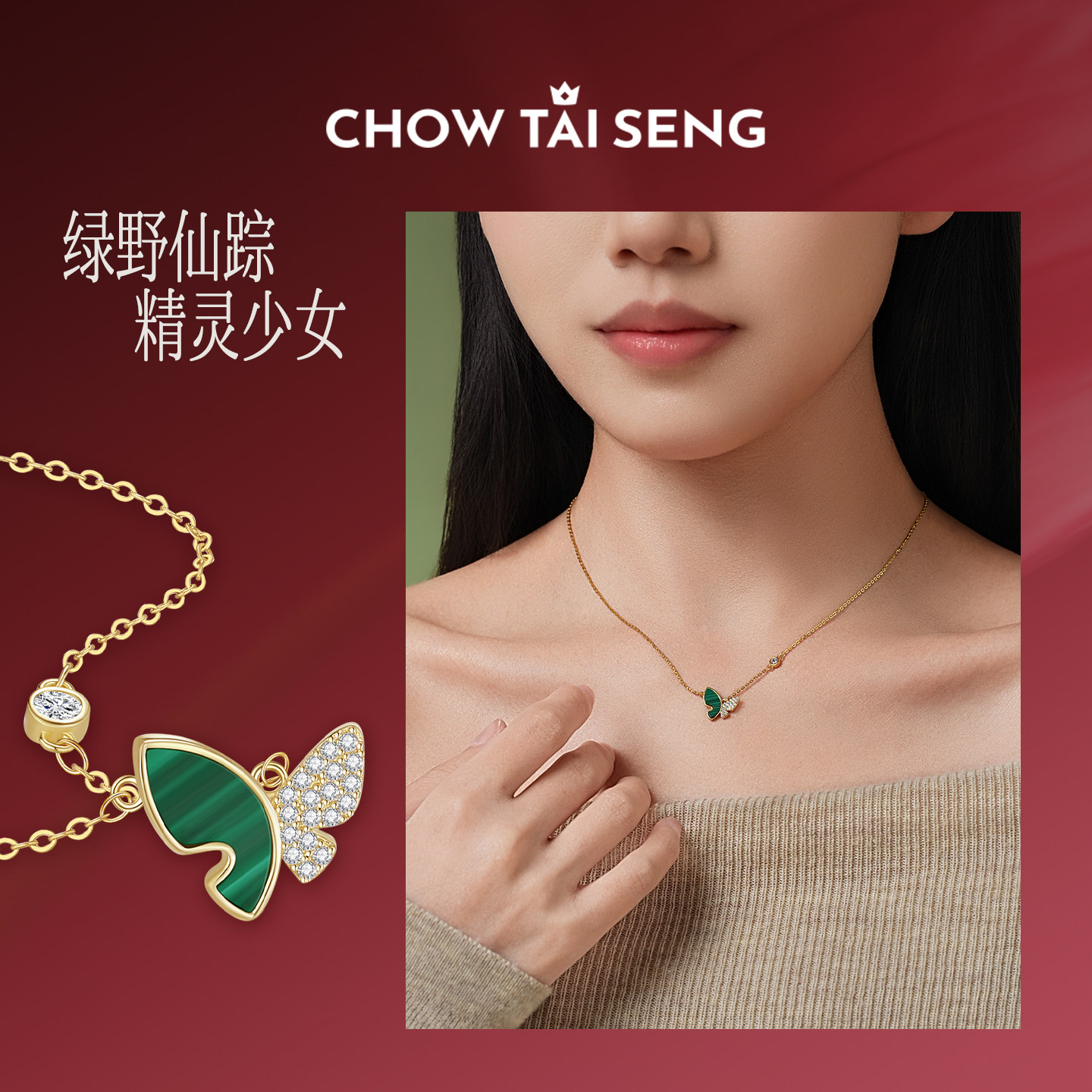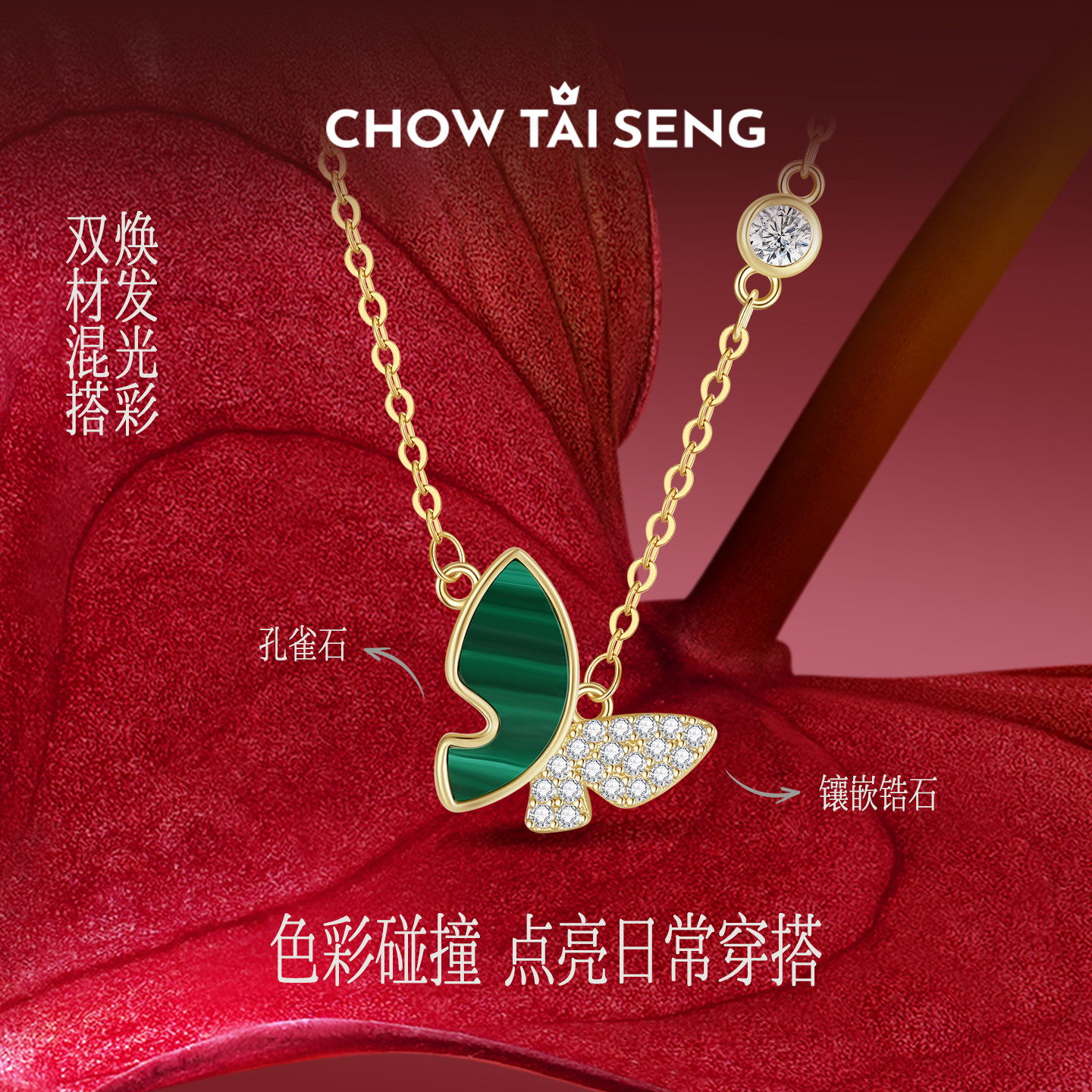 周大生绿野仙踪蝴蝶项链女款S925纯银锁骨链孔雀石生日礼物送女生