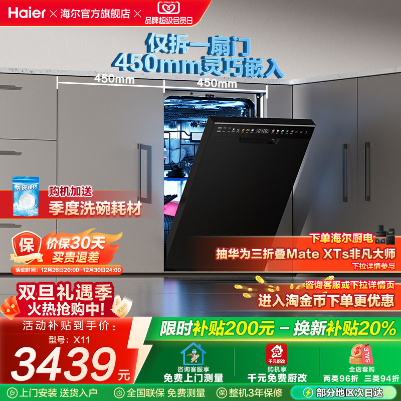 海尔超窄洗碗机X11/S双面洗14套大容量家用消毒全自动嵌入式变频