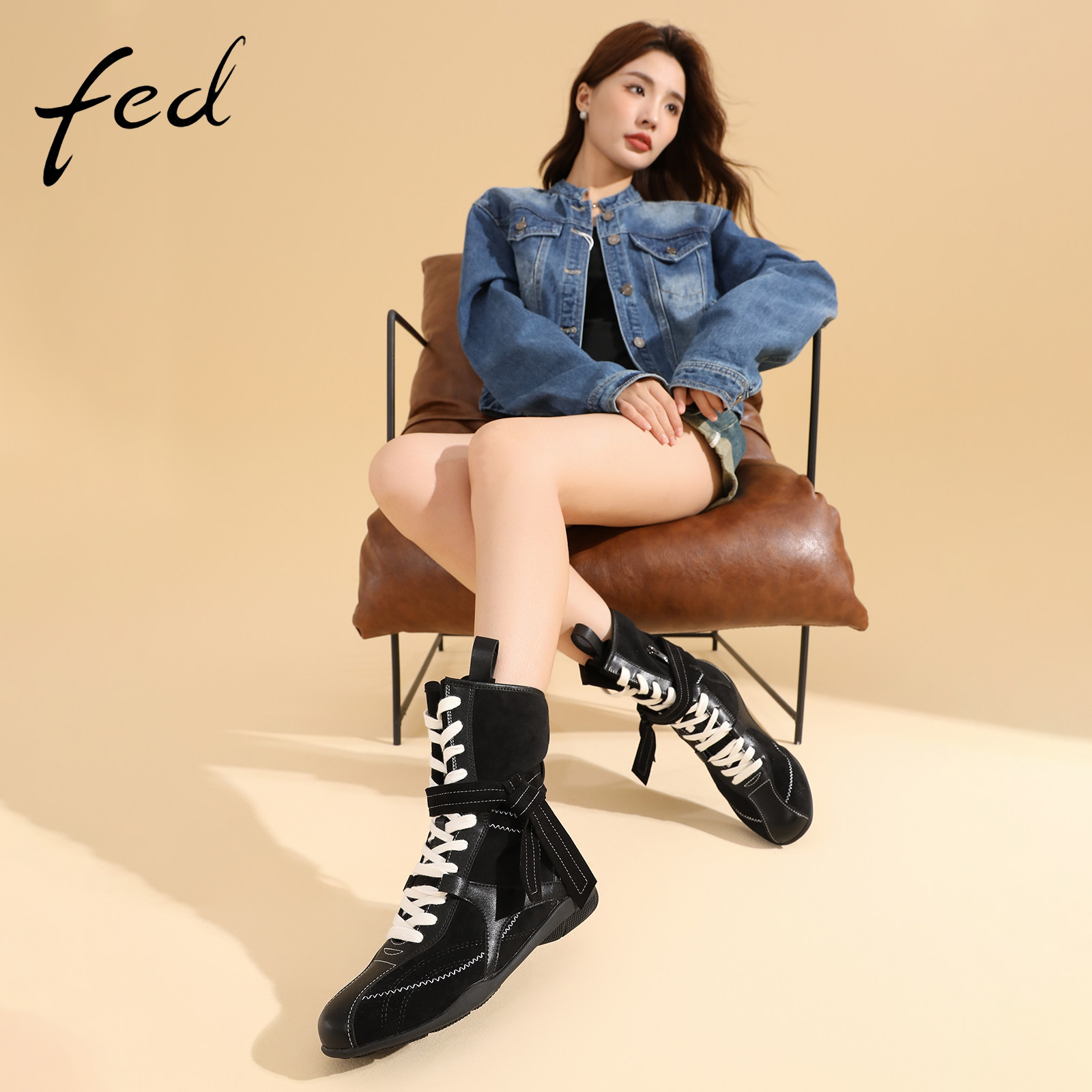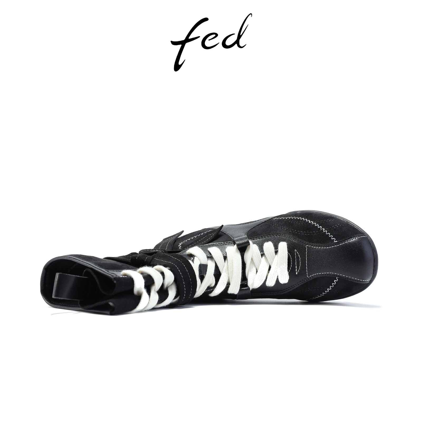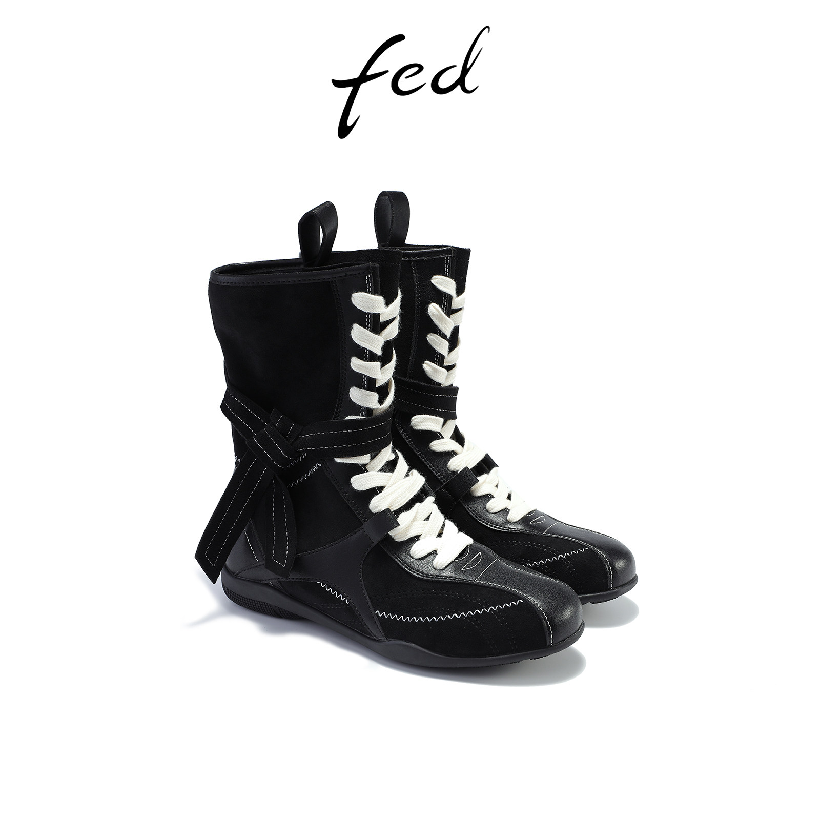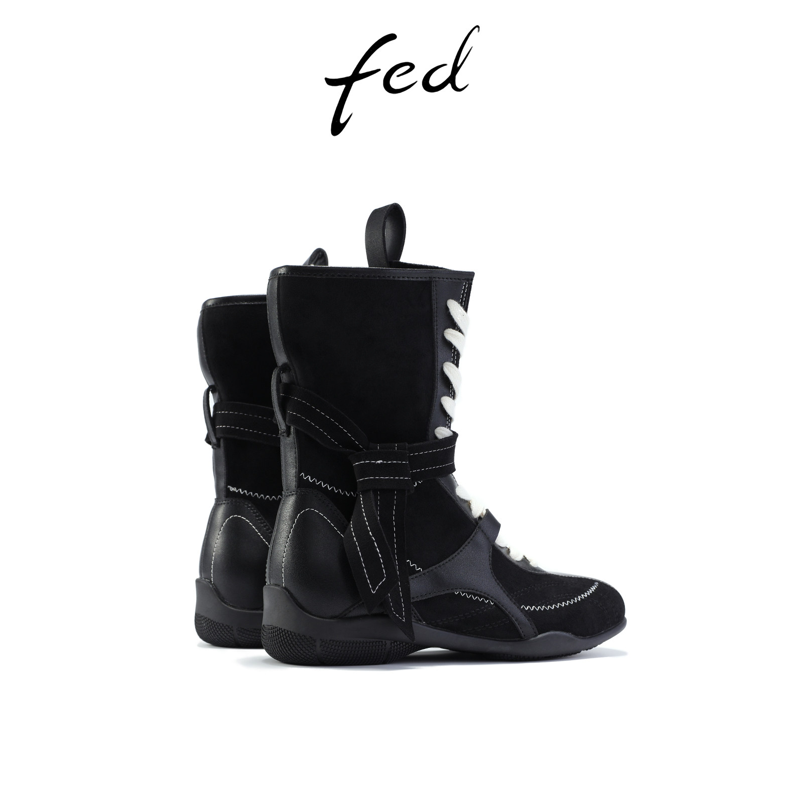 fed薄底拳击靴冬季新款女靴绑带机车短靴黑色西部靴女S0905-ZC382