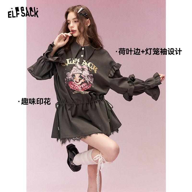妖精的口袋原创印花蕾丝拼接连衣裙女2026早春新款甜美卫衣裙短裙