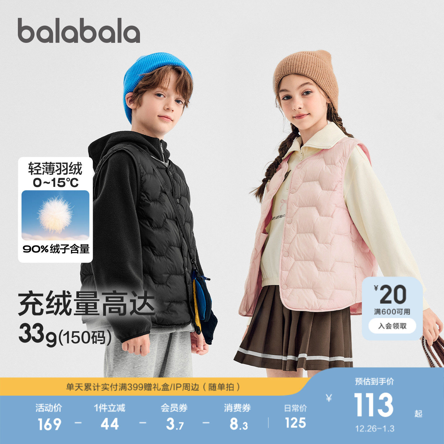 巴拉巴拉童装儿童羽绒马甲女童男童外穿新款2025冬装高充绒保暖潮