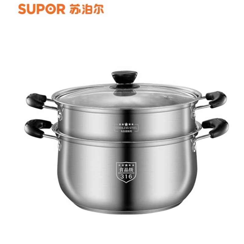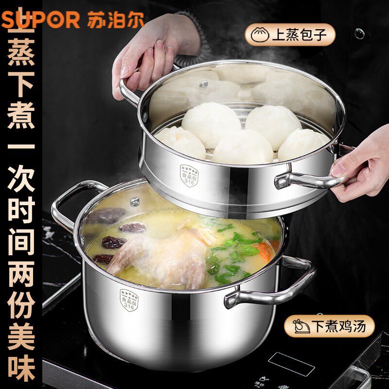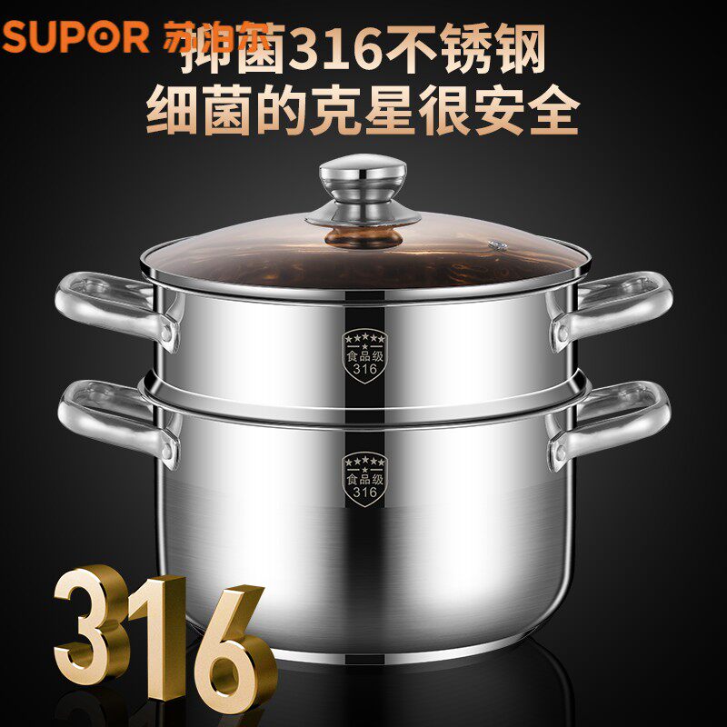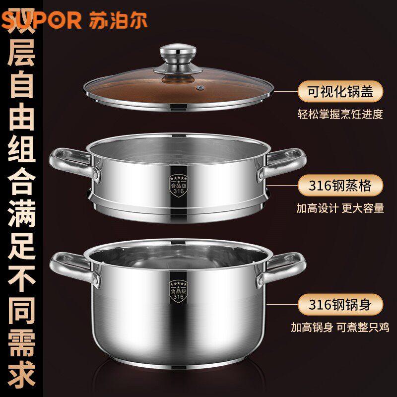 苏泊尔小蒸锅316不锈钢三层加厚家用汤锅带蒸笼双多2层电磁炉煤气