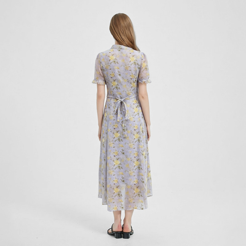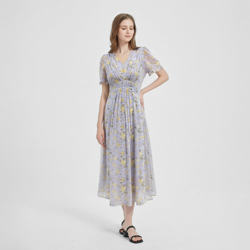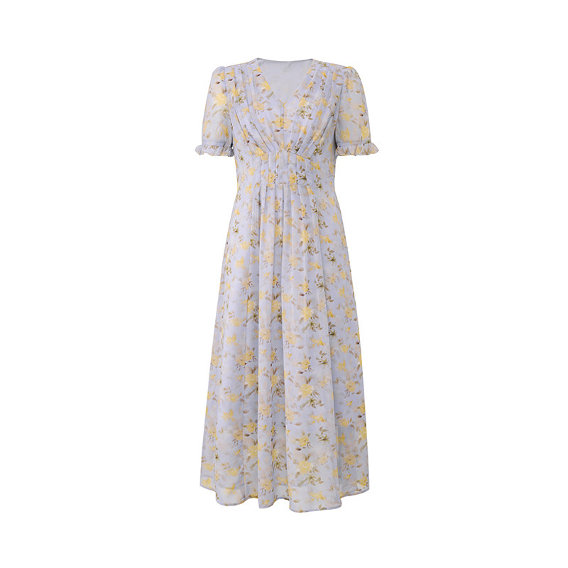 法式浪漫碎花褶皱收腰雪纺连衣裙