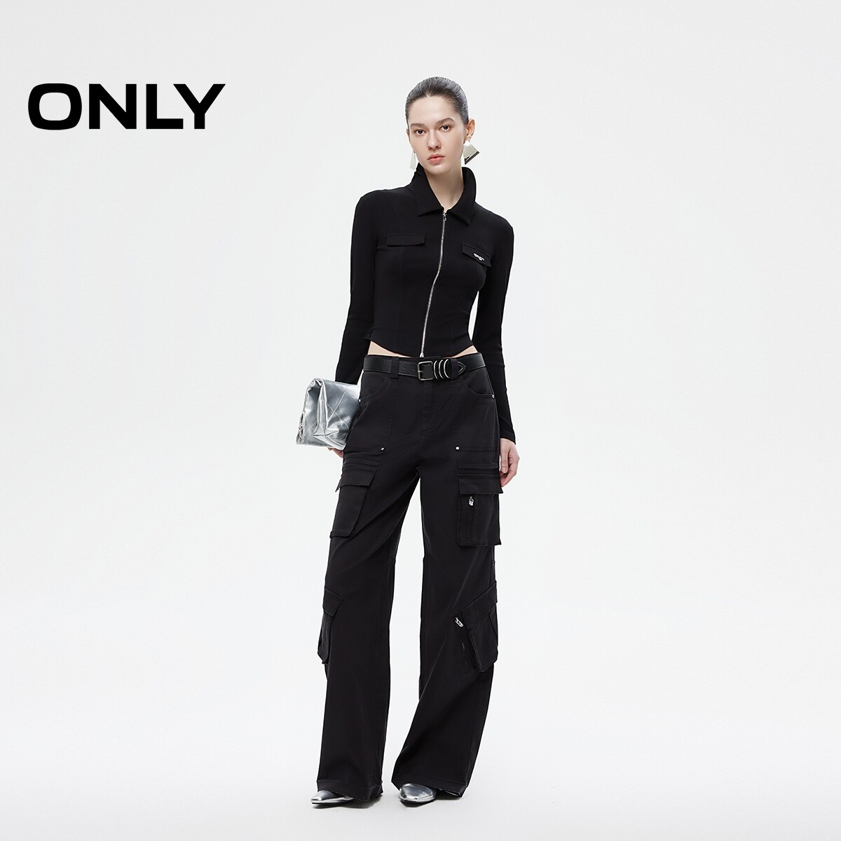 ONLY2026春季新款时尚辣妹风正肩翻领拉链开衫黑色T恤女