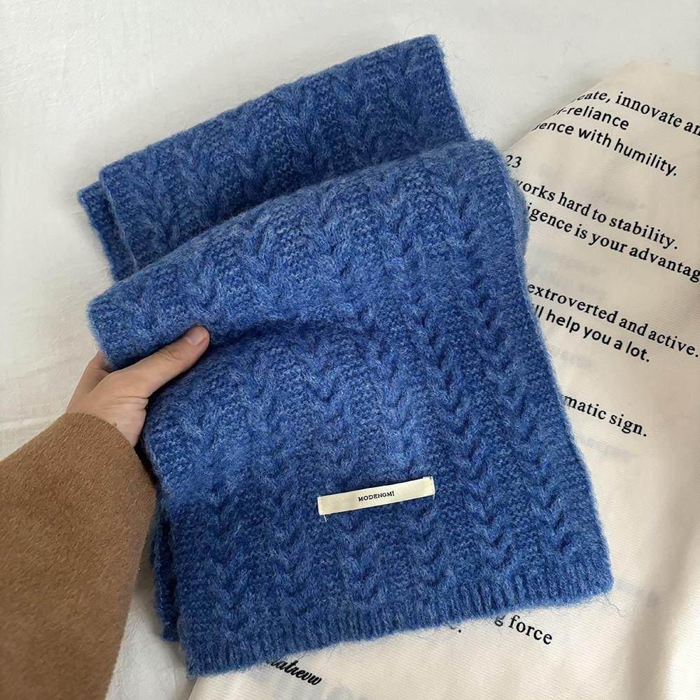 蓝色小众秋冬针织围巾女韩版麻花柔软含羊毛加厚保暖毛线围脖冬季