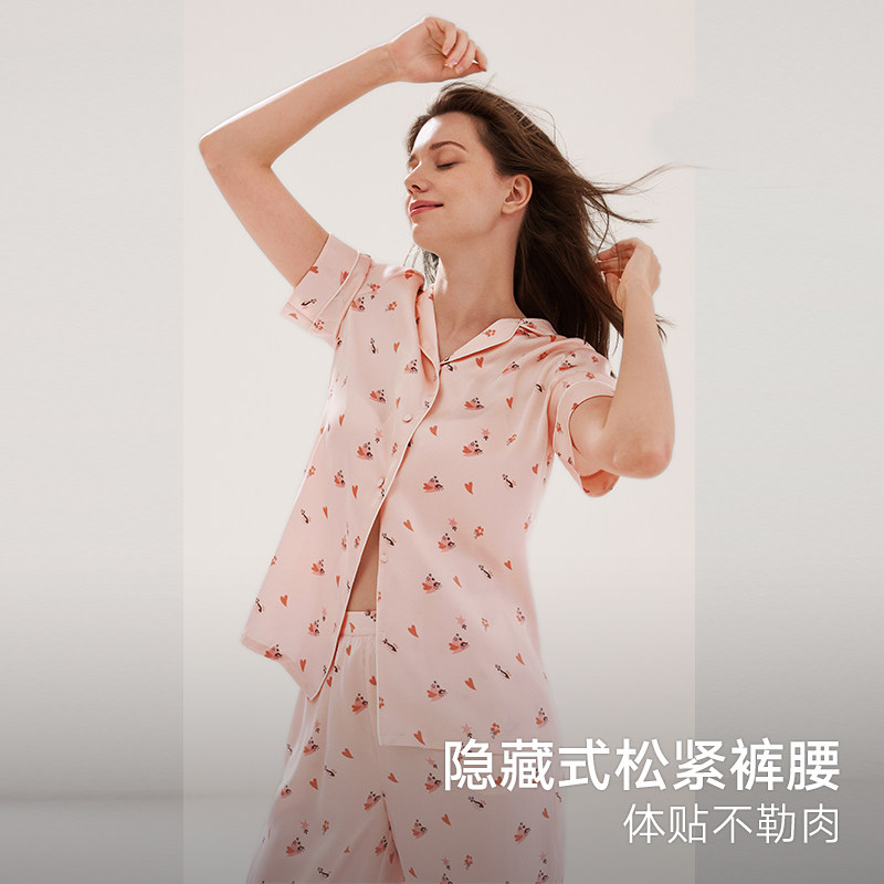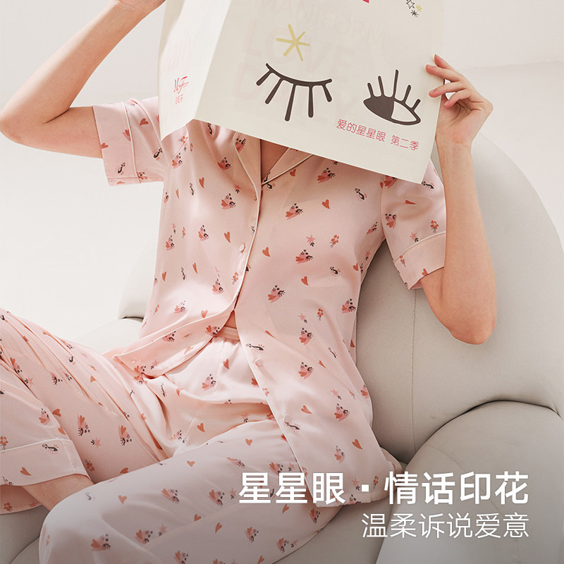 爱的星星眼曼妮芬印花雪纺缎翻领短袖套装可外穿家居服女士睡衣