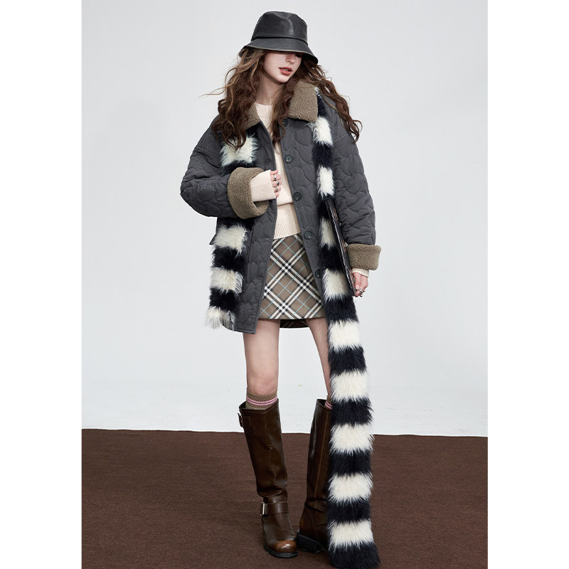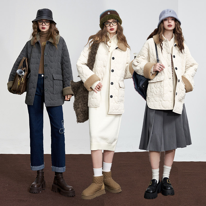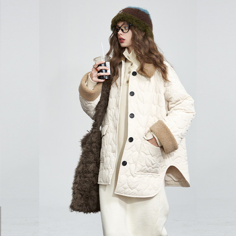 妖精的口袋白色翻领拼接棉服女2026年冬季新款设计感轻薄棉衣外套