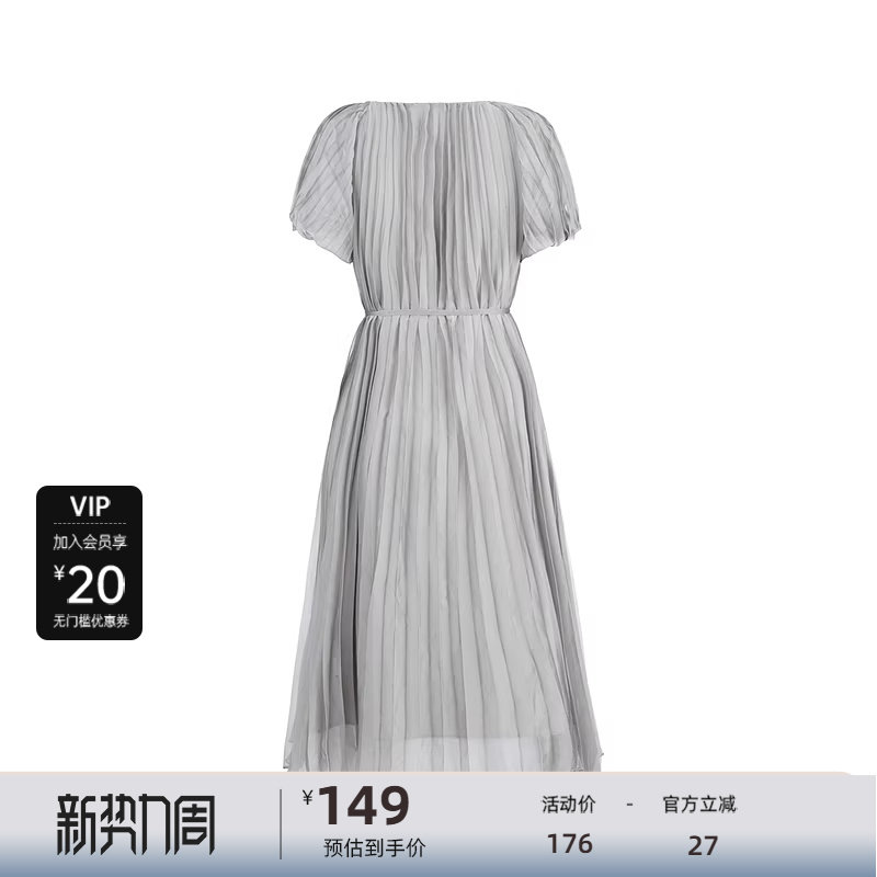 sdeer圣迪奥女装圆领压褶收腰泡泡袖连衣裙S223Z12D6