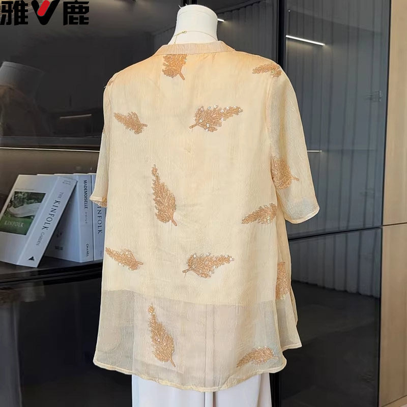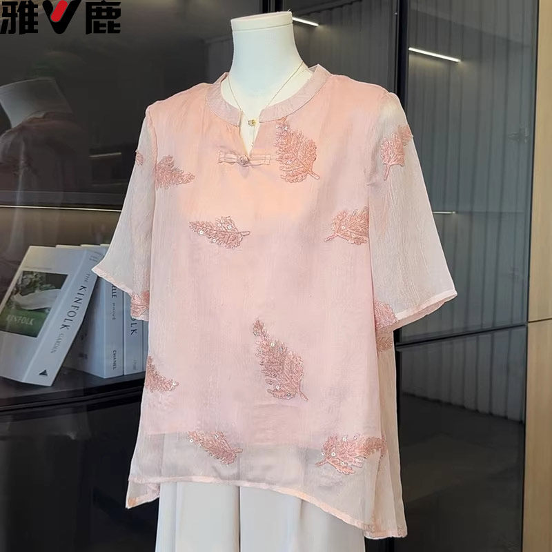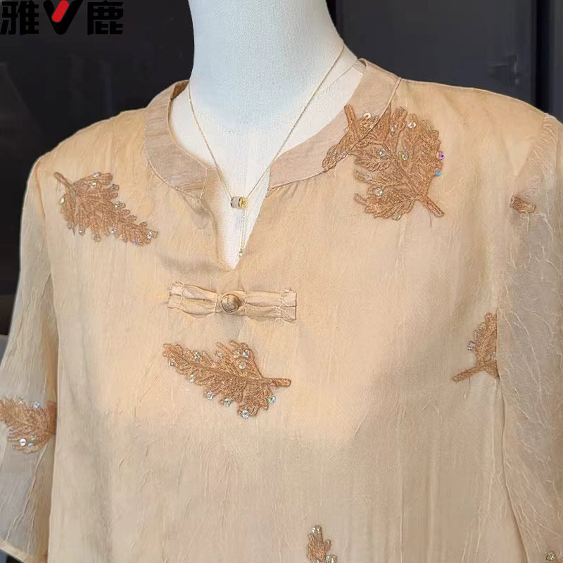 雅鹿国风中年妈妈夏装短袖T恤套装雪纺小衫中老年女装绣花上衣服