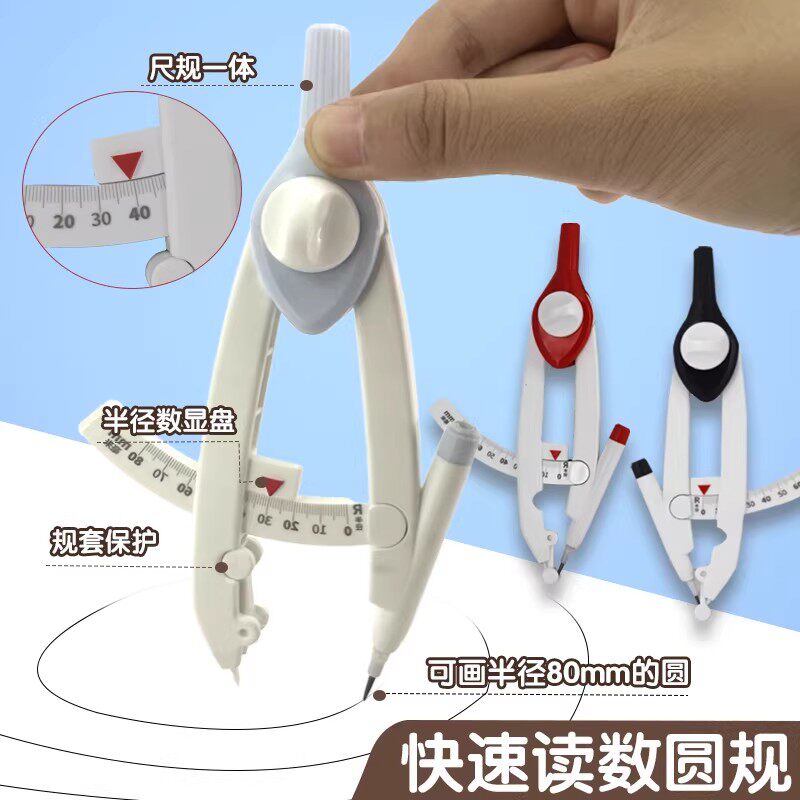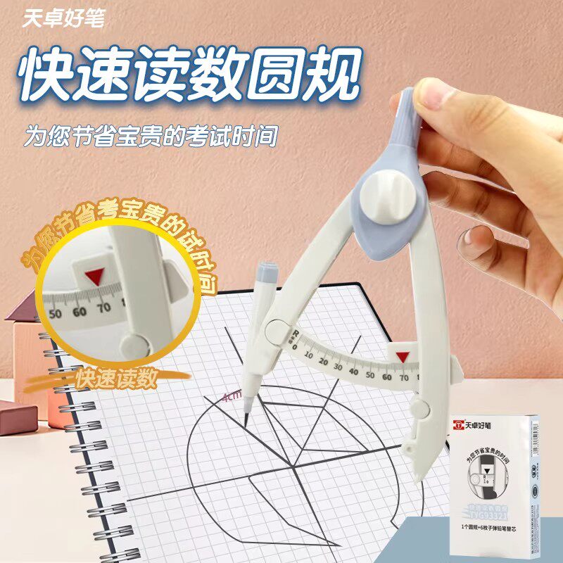 天卓新圆规小学生专用制图工具画圆神器按动高颜值初中生数显多功能锁距尺规附替换笔芯套装儿童教学学习