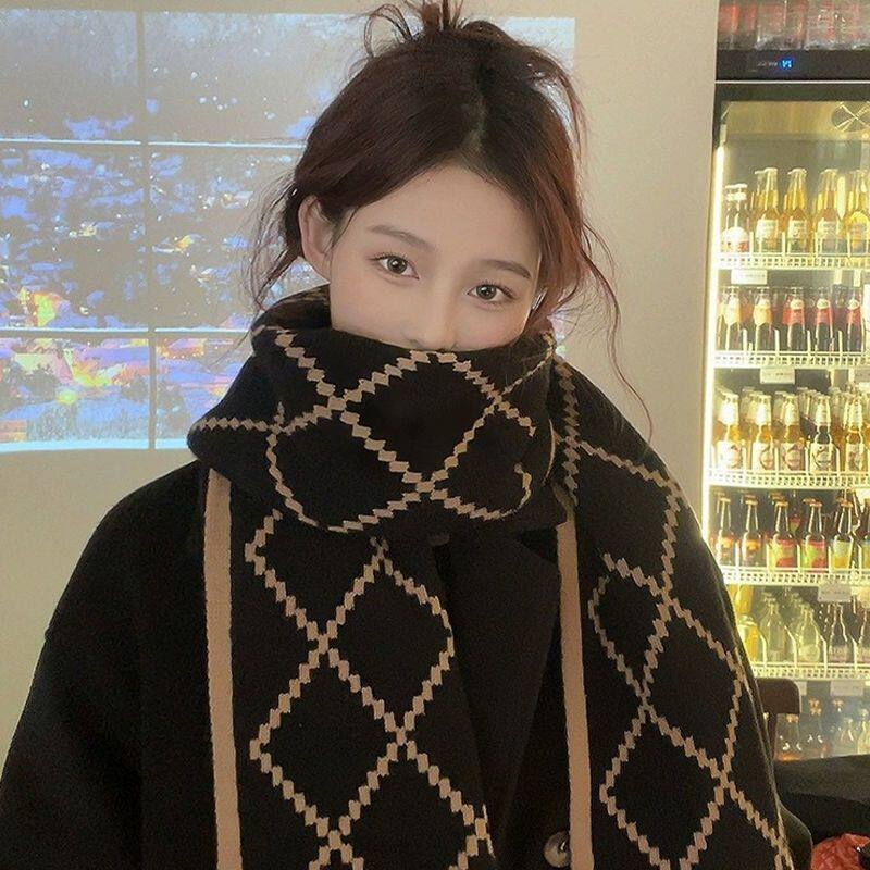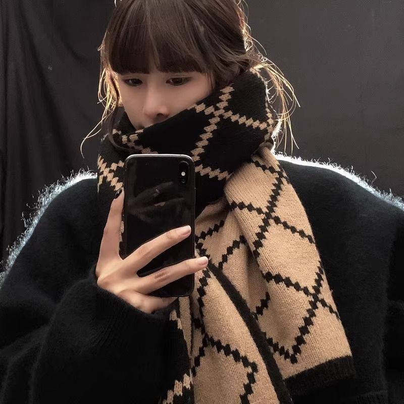 秋冬季加厚双面针织围巾女格子保暖围脖护肩黑白红白护颈韩系氛围