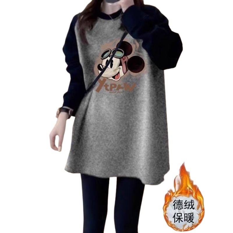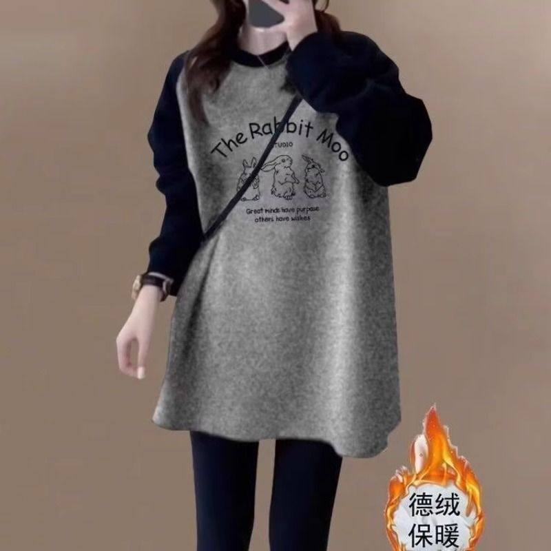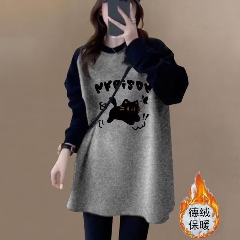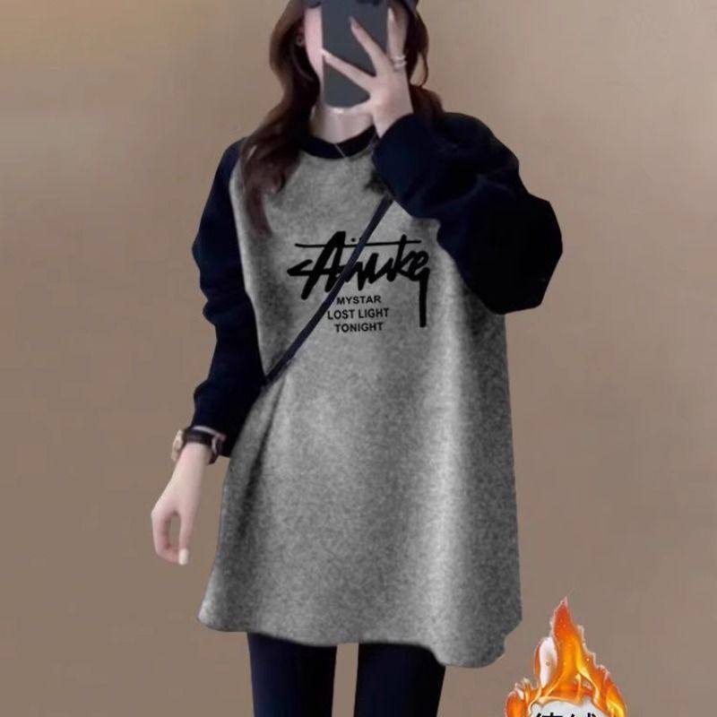 德绒撞色长袖t恤女中长款韩版大码宽松休闲上衣保暖打底衫秋冬季
