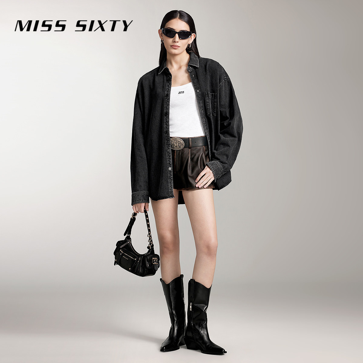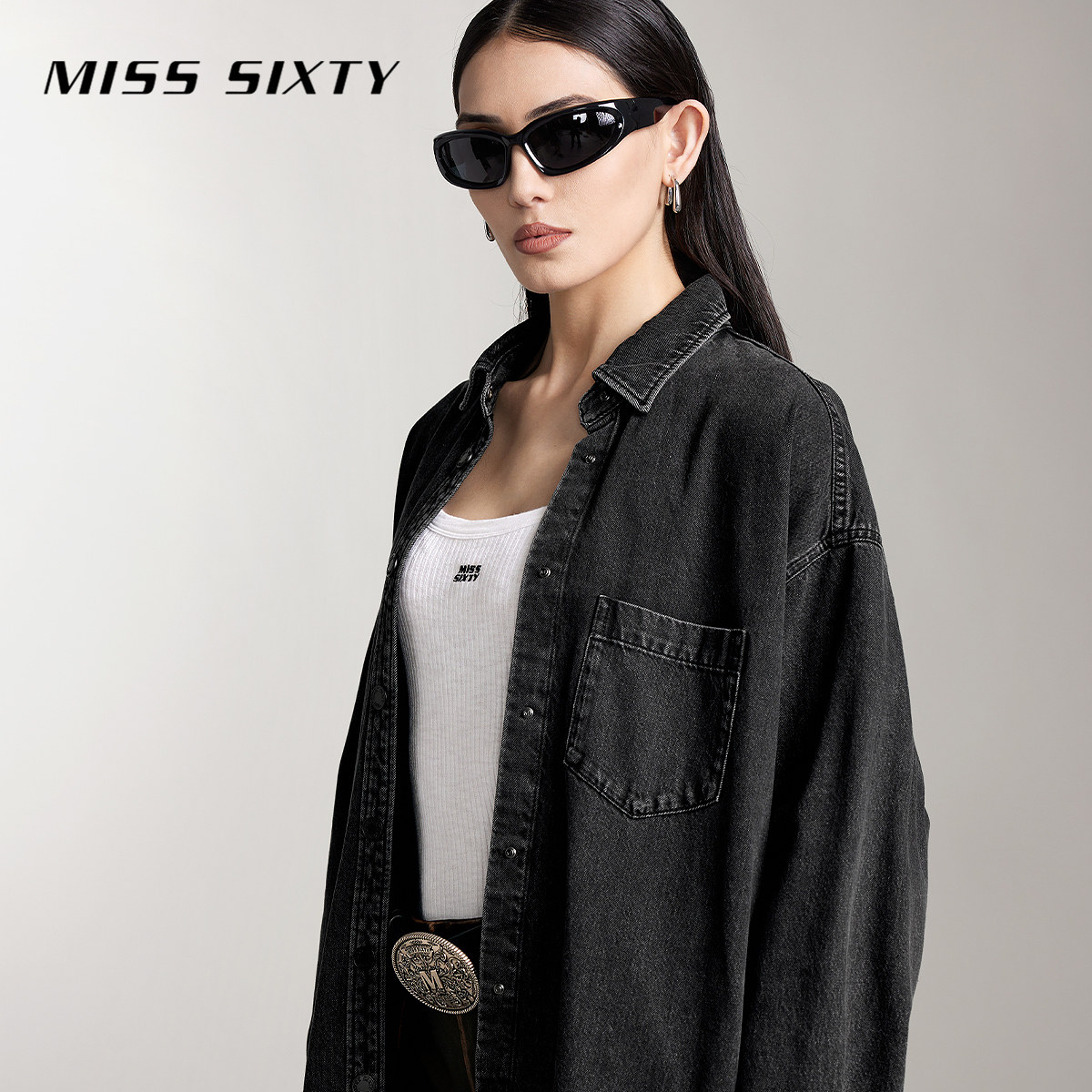Miss Sixty牛仔衬衫女复古水洗印花宽松显瘦百搭工装长款黑灰色