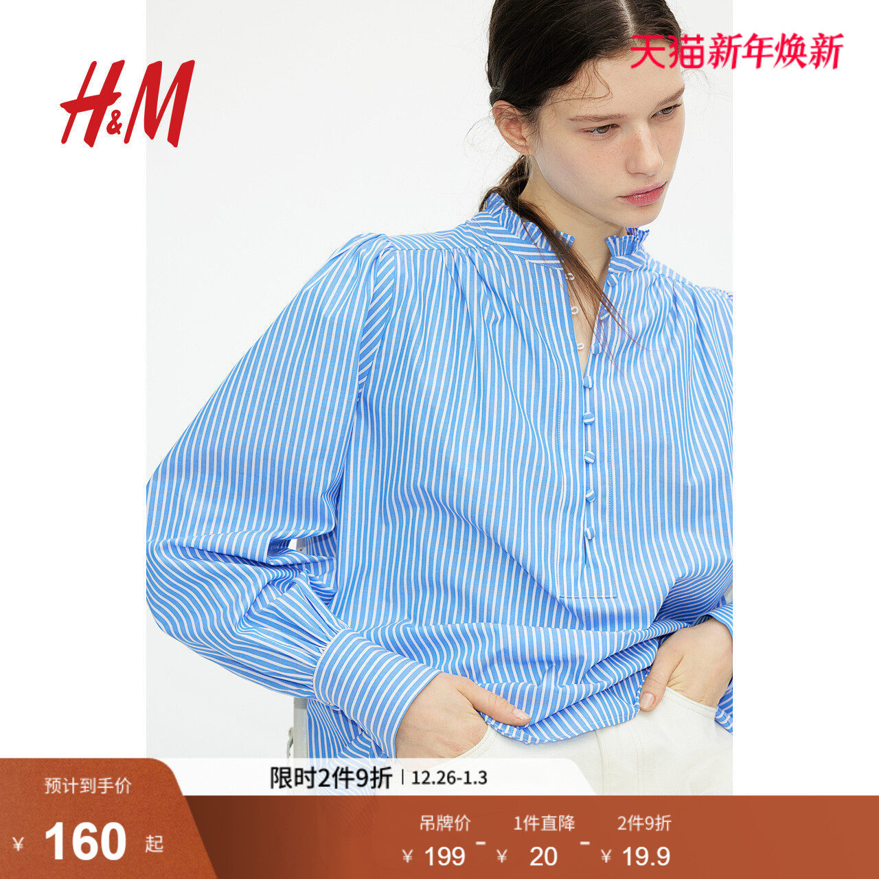 HM女装衬衫2025年冬季新款时尚休闲褶皱领棉质花边衬衣1270106