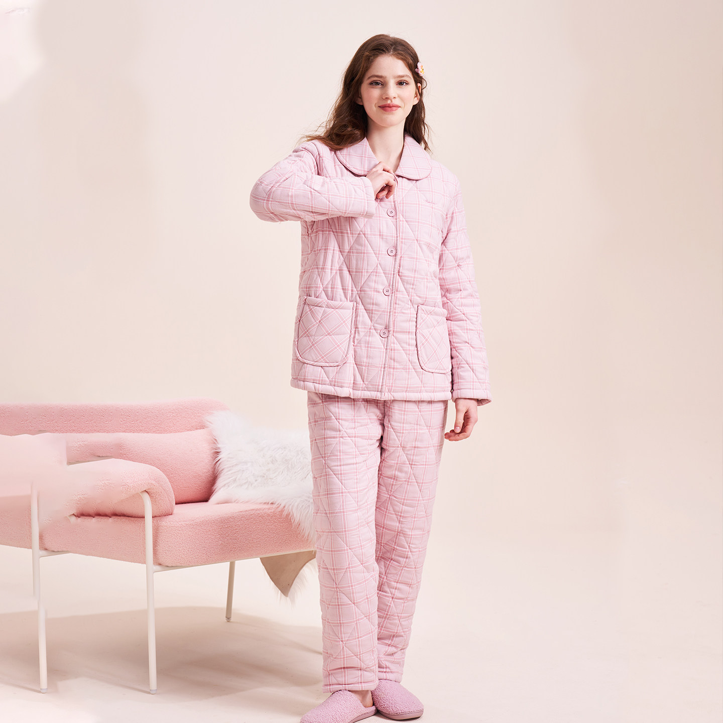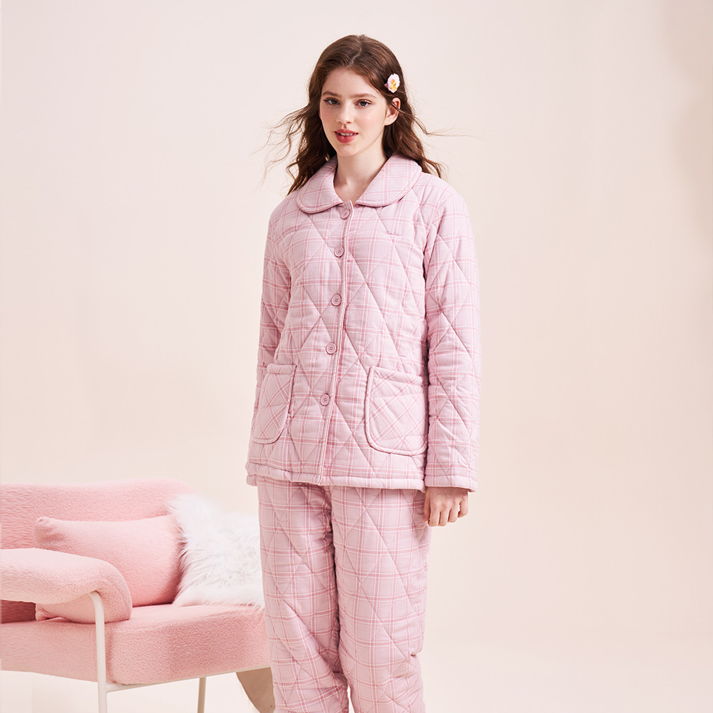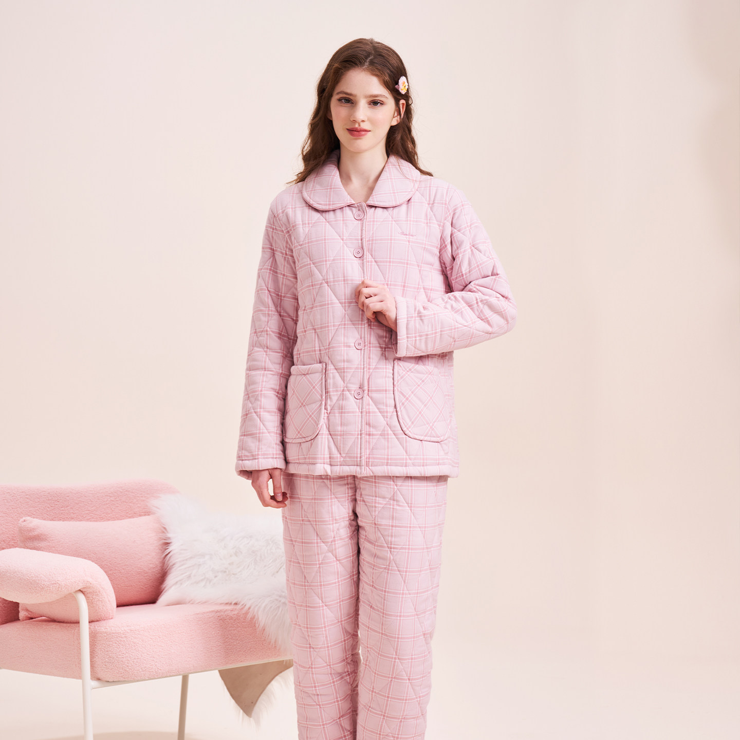 美标秋冬三层加厚夹棉纯棉睡衣套装女格子休闲全棉质可外穿家居服