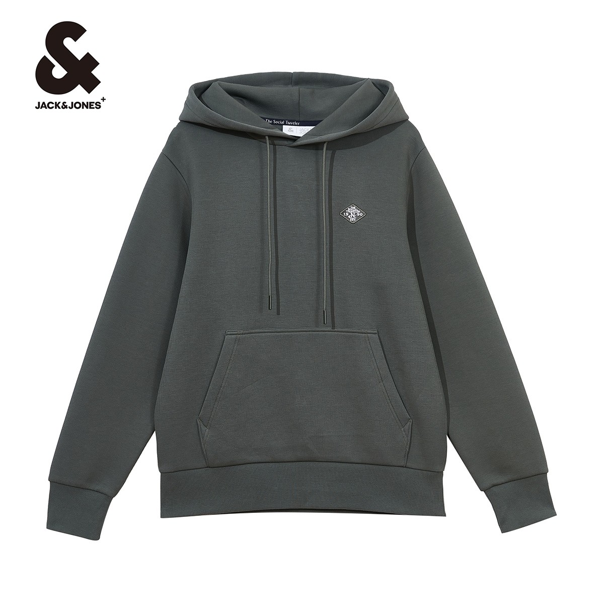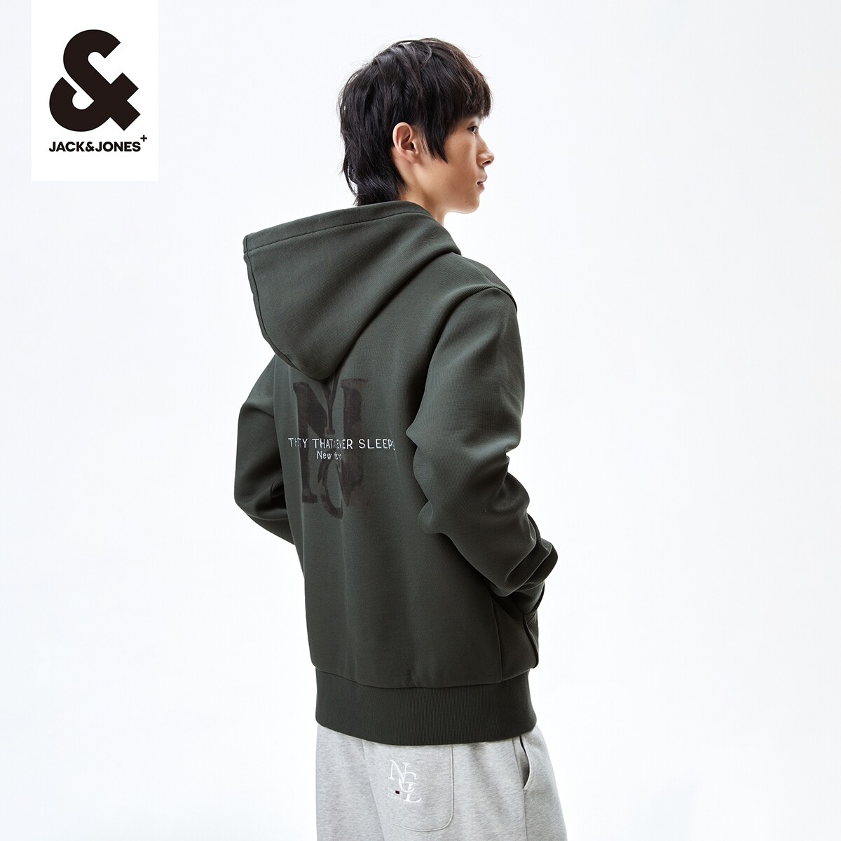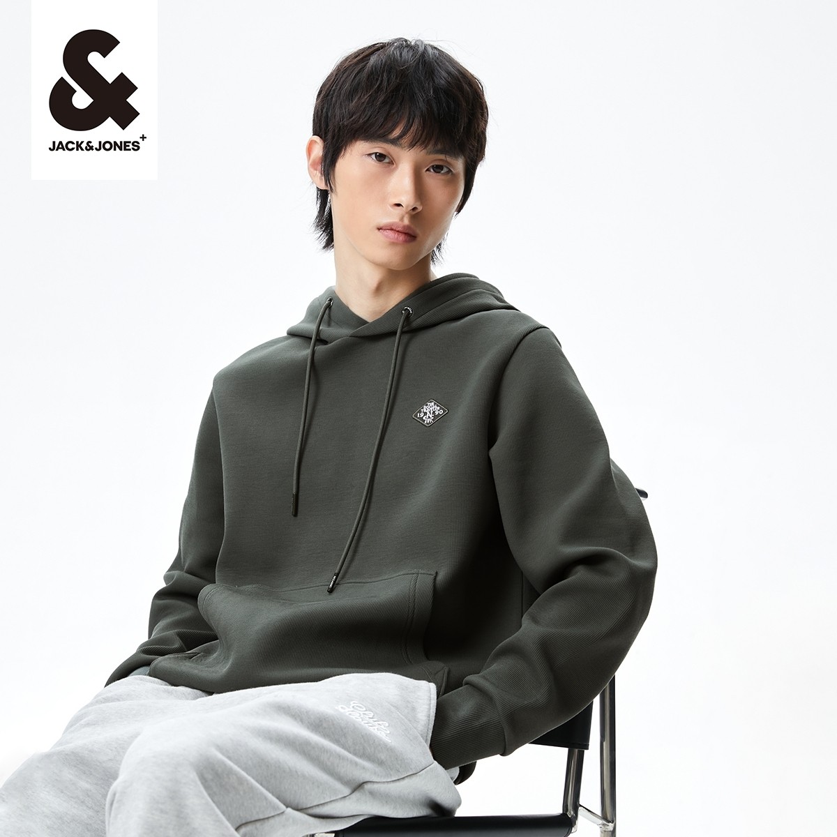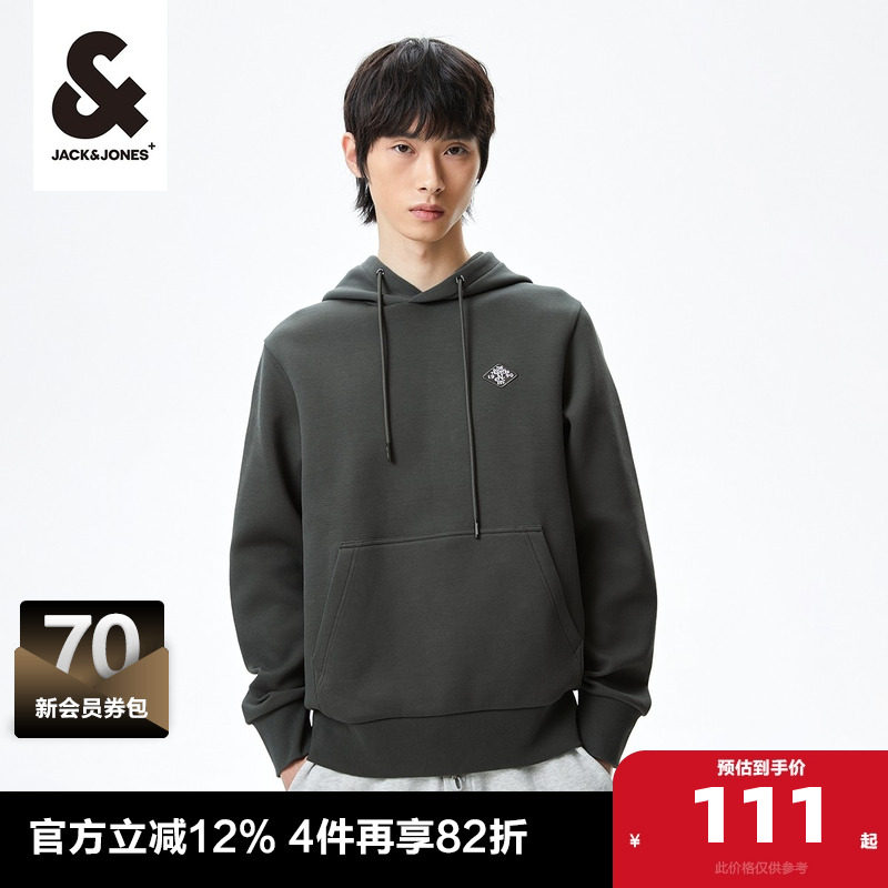 杰克琼斯秋季新款潮流休闲舒适刺绣字母装饰抽绳连帽纯色卫衣男装
