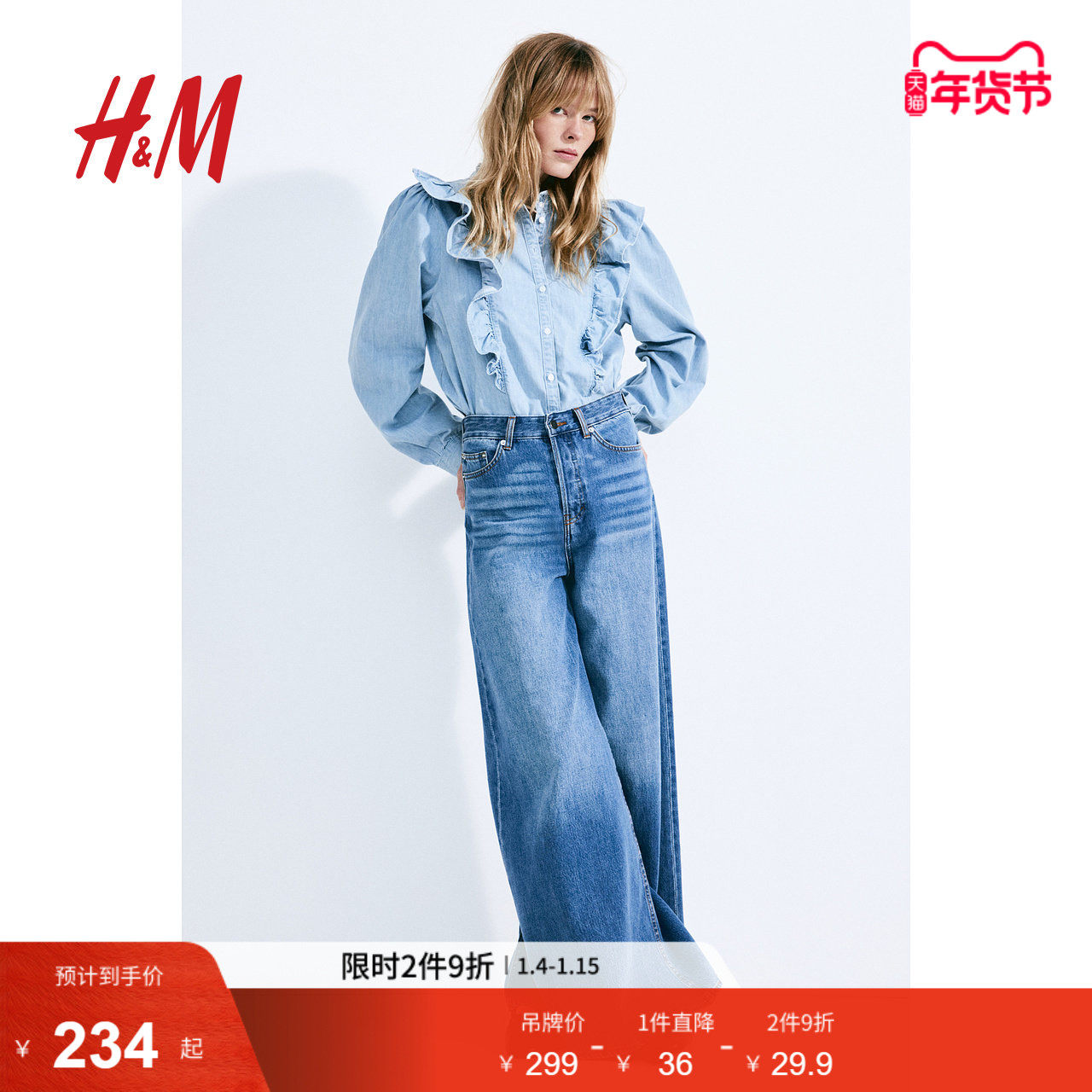 HM女装衬衫冬季时尚休闲褶边宽松版柔软棉质上衣1262585