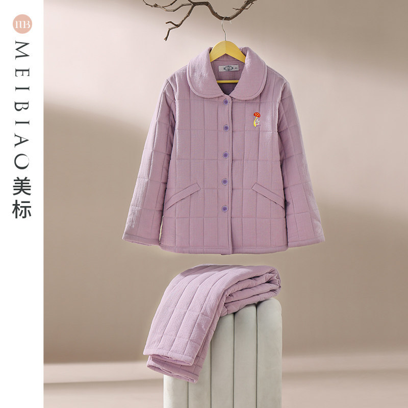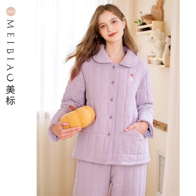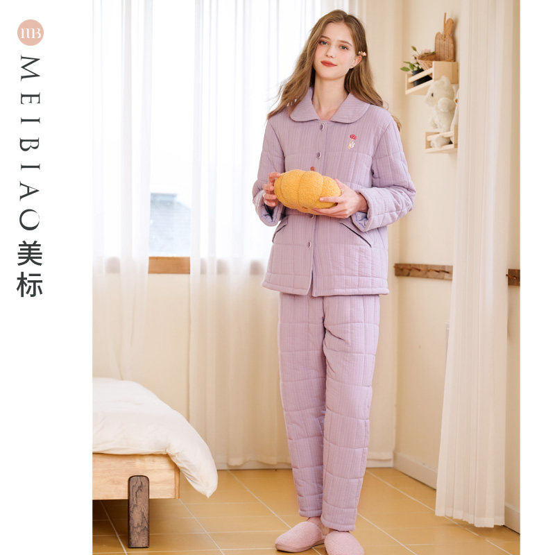 美标新款三层加厚保暖夹棉睡衣套装女冬甜美卡通全棉质纯棉家居服