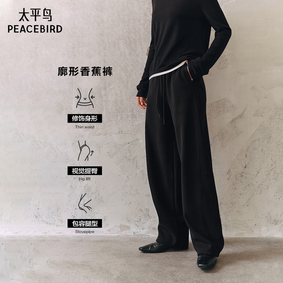 太平鸟高腰加绒弯刀运动裤秋冬款保暖加厚黑色茧型香蕉休闲裤女*
