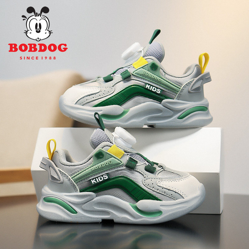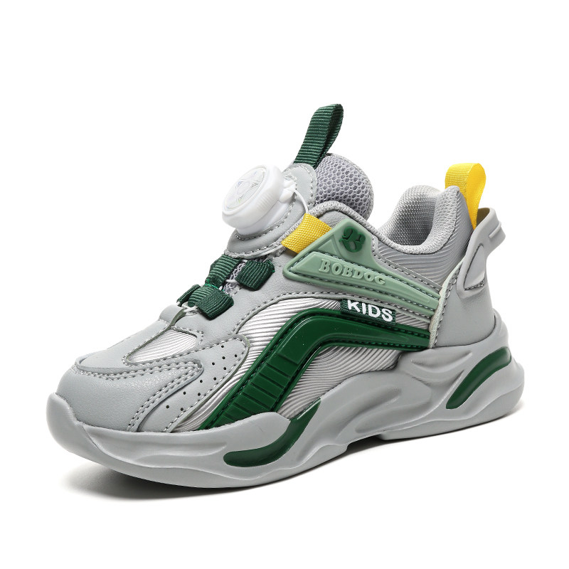 巴布豆男童鞋子皮面防水2025新款秋季中童旋转扣跑步鞋儿童运动鞋