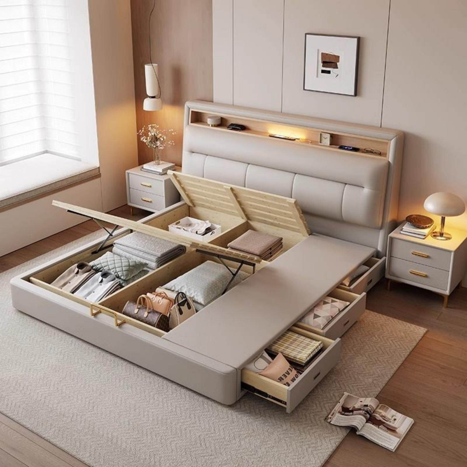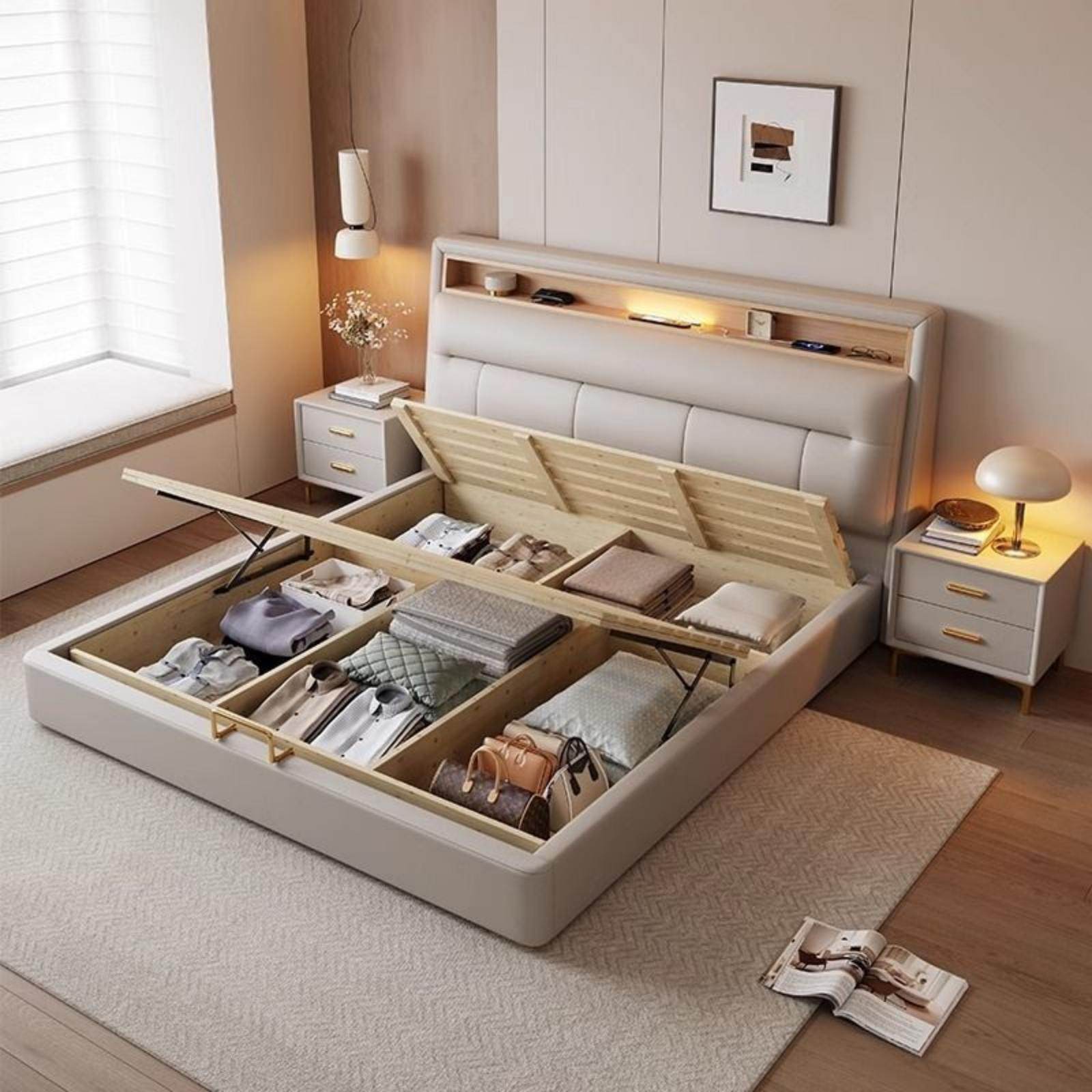 现代简约家用1.5米1.8米主卧气压功能奶油风储物可定制高端真皮床