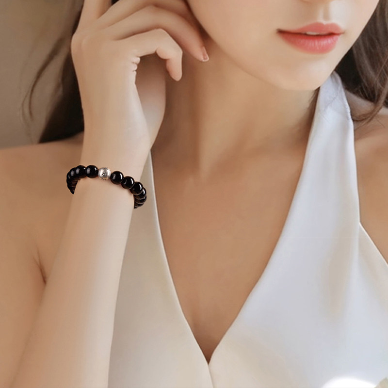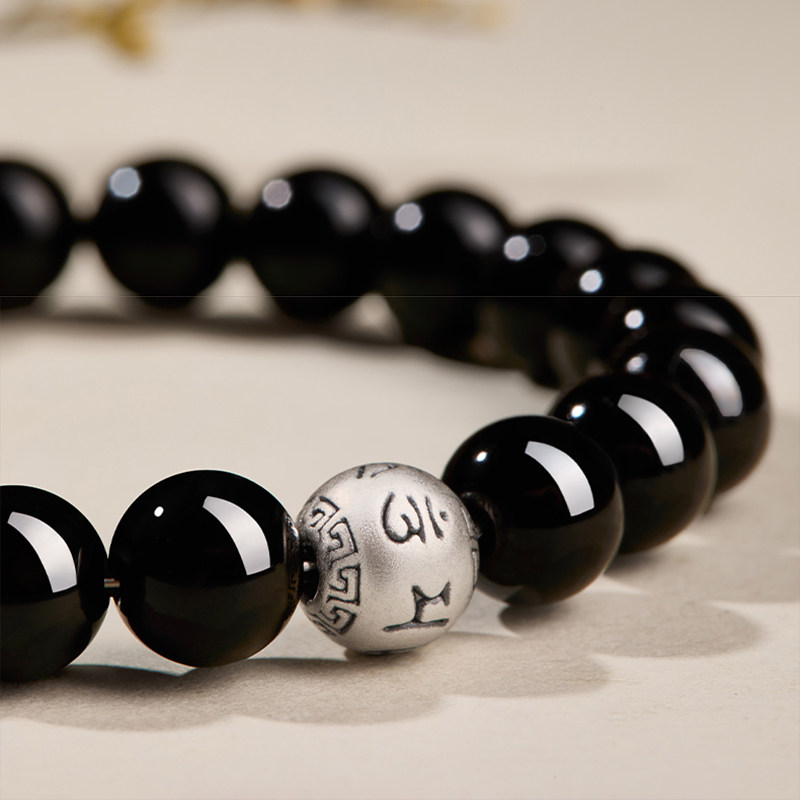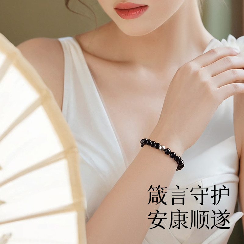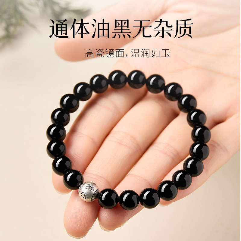 天然黑曜石手串女款好运纯银箴言真品转运珠男手链七夕情人节礼物