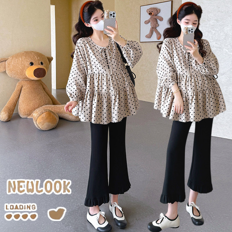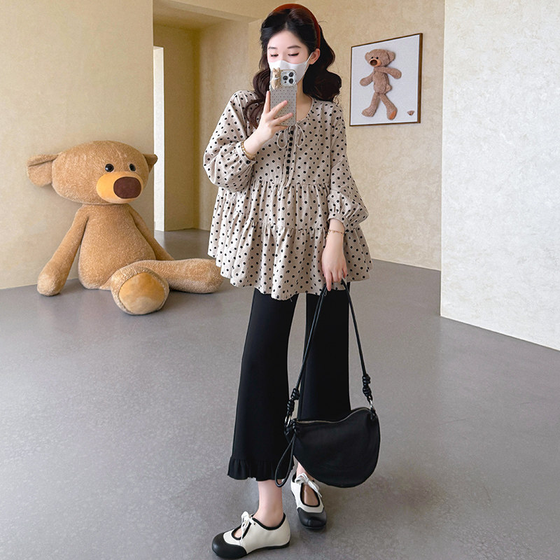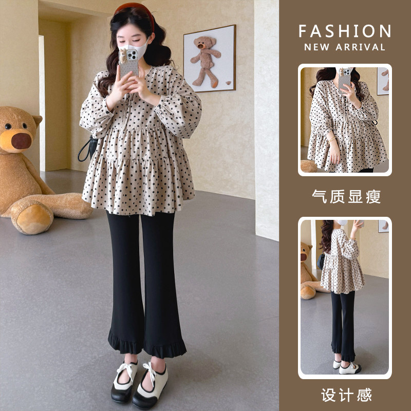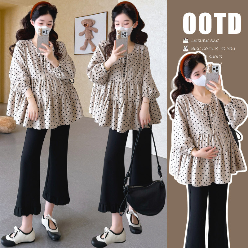 婧麒孕妇装娃娃衫宽松显瘦波点上衣洋气遮孕肚灯笼九分袖波点上衣