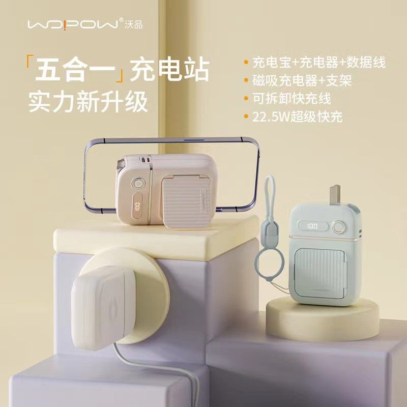 沃品五合一自带AC充电器插头充电宝磁吸无线快充隐藏式支架PA008