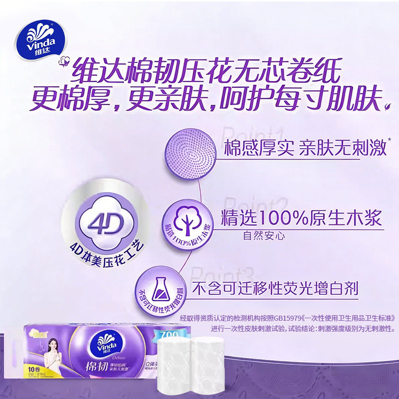 维达纸巾无芯卷纸超韧4层10卷家用卫生纸实芯卷筒纸厕纸手纸提装