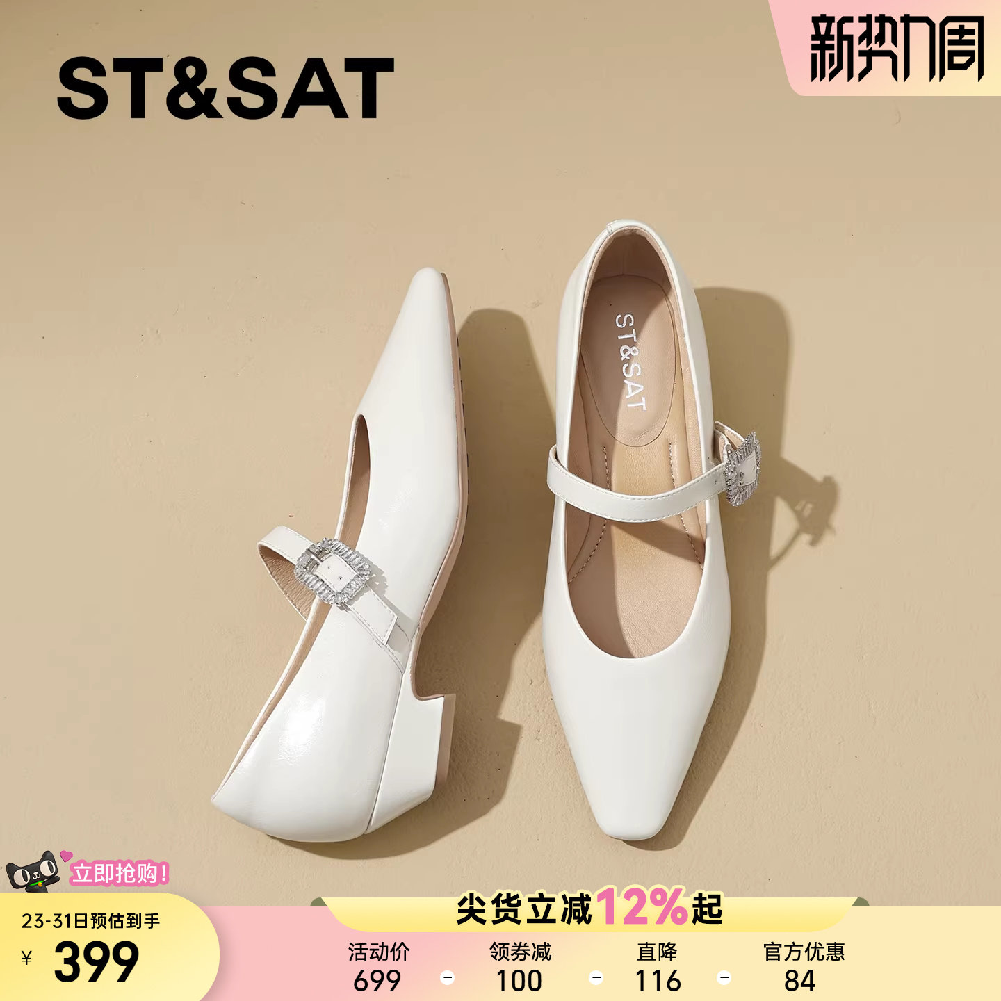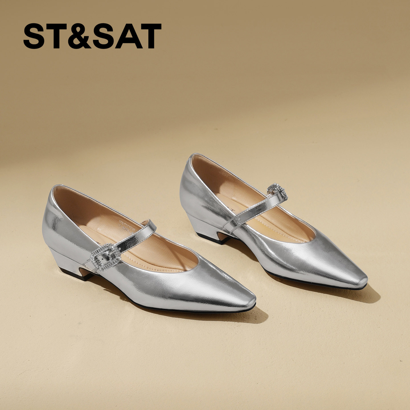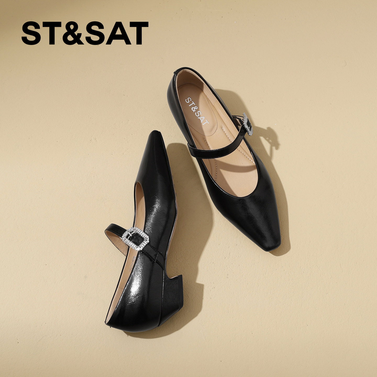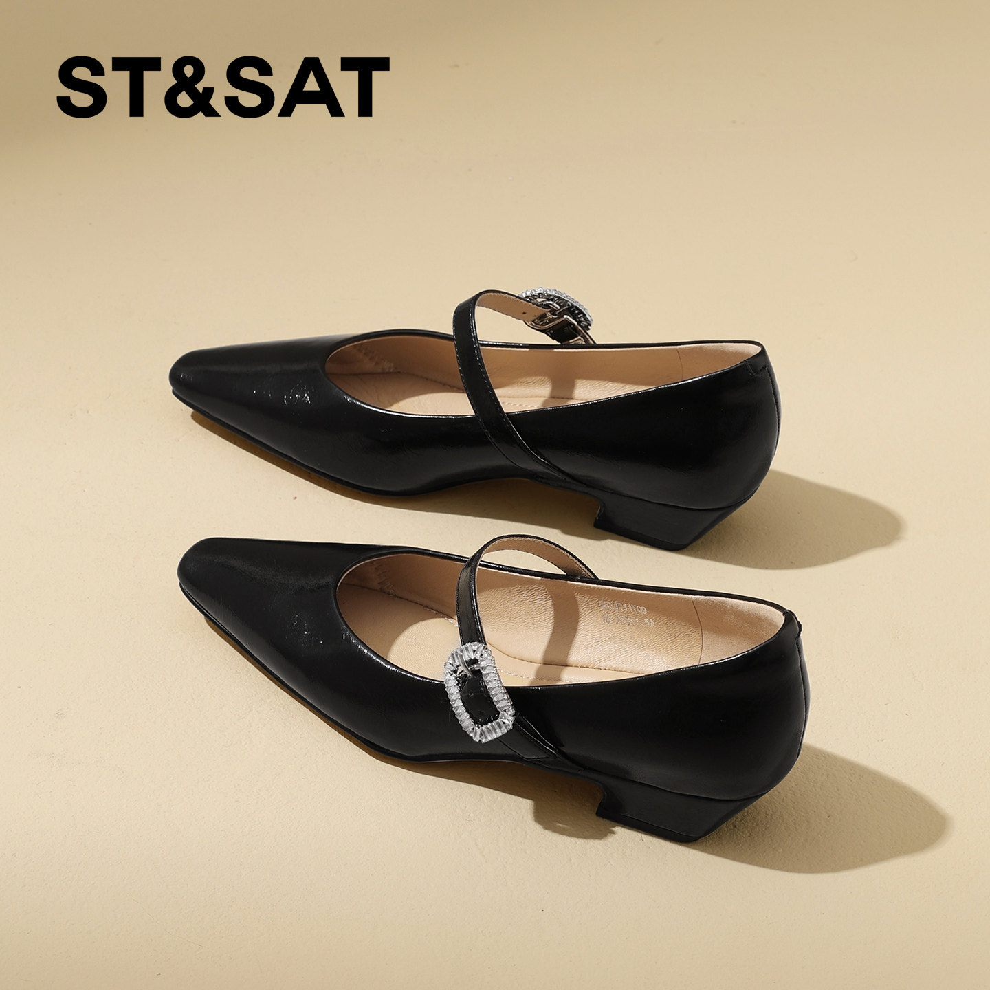 星期六简约方头粗跟玛丽珍鞋女2026春新款水钻一字扣坡跟浅口单鞋