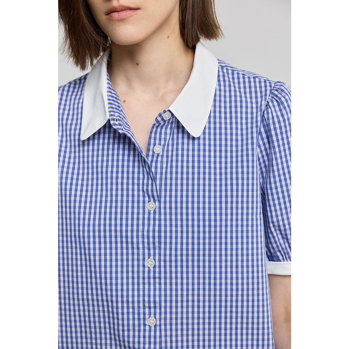 LILY2026新款简约气质蓝色格纹宽松休闲百搭通勤短袖衬衫外套女