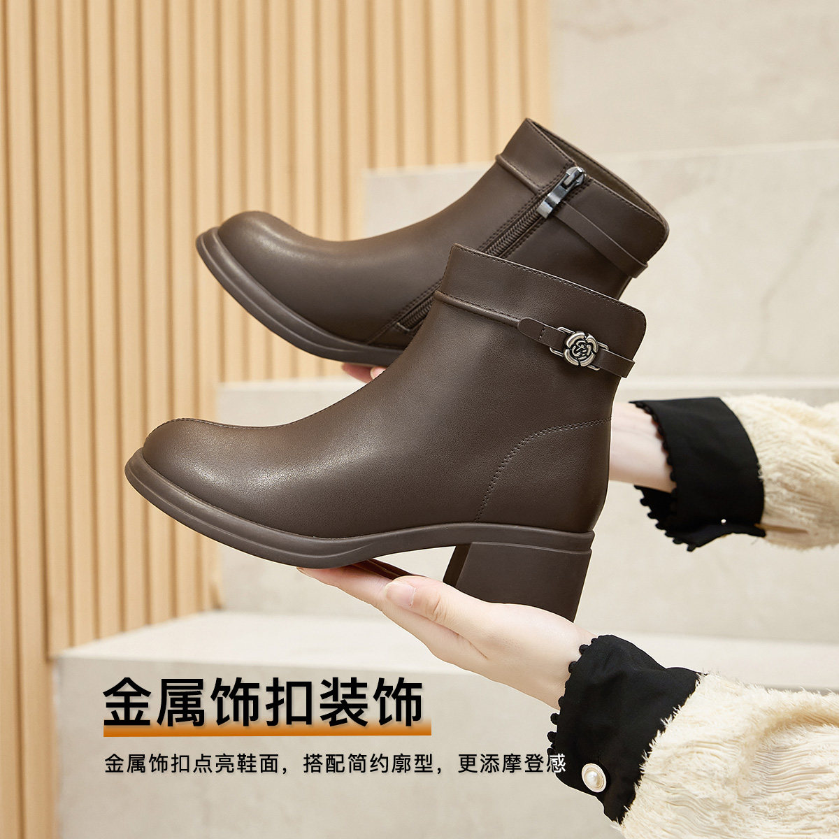 真皮~内增高复古机车马丁靴女秋金属扣擦色粗跟厚底西部堆堆短靴
