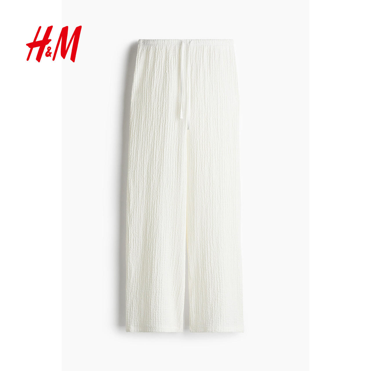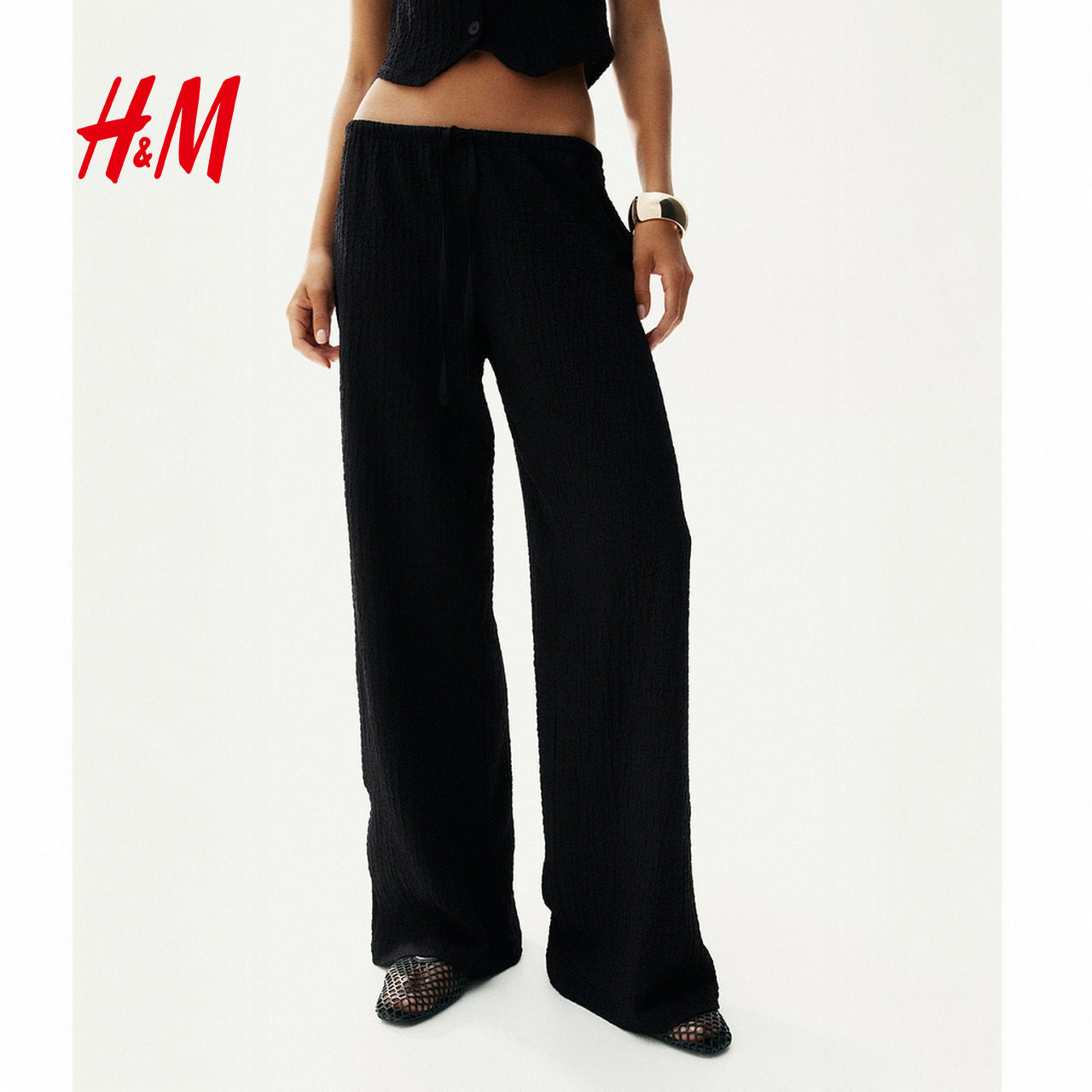 HM女装休闲裤2025冬季新款松紧腰直筒宽松皱感抽绳长裤1259463