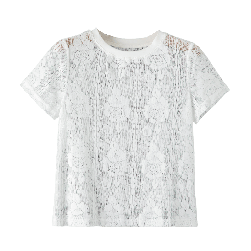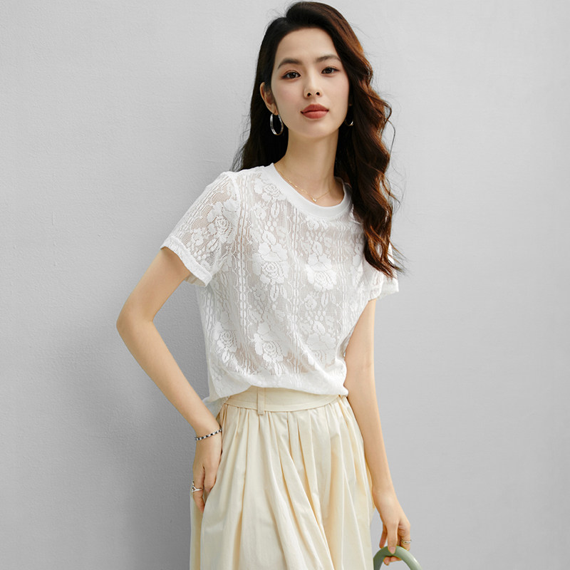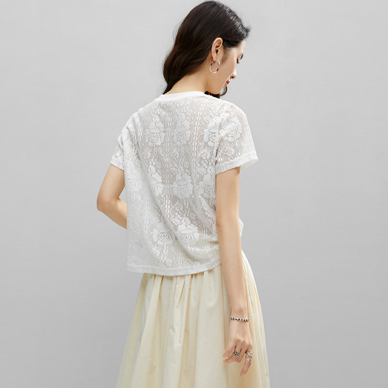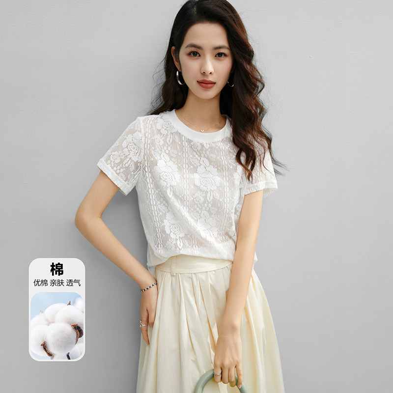 晚白2026年春新款时尚白色蕾丝短袖上衣棉质圆领亲肤T恤衫女