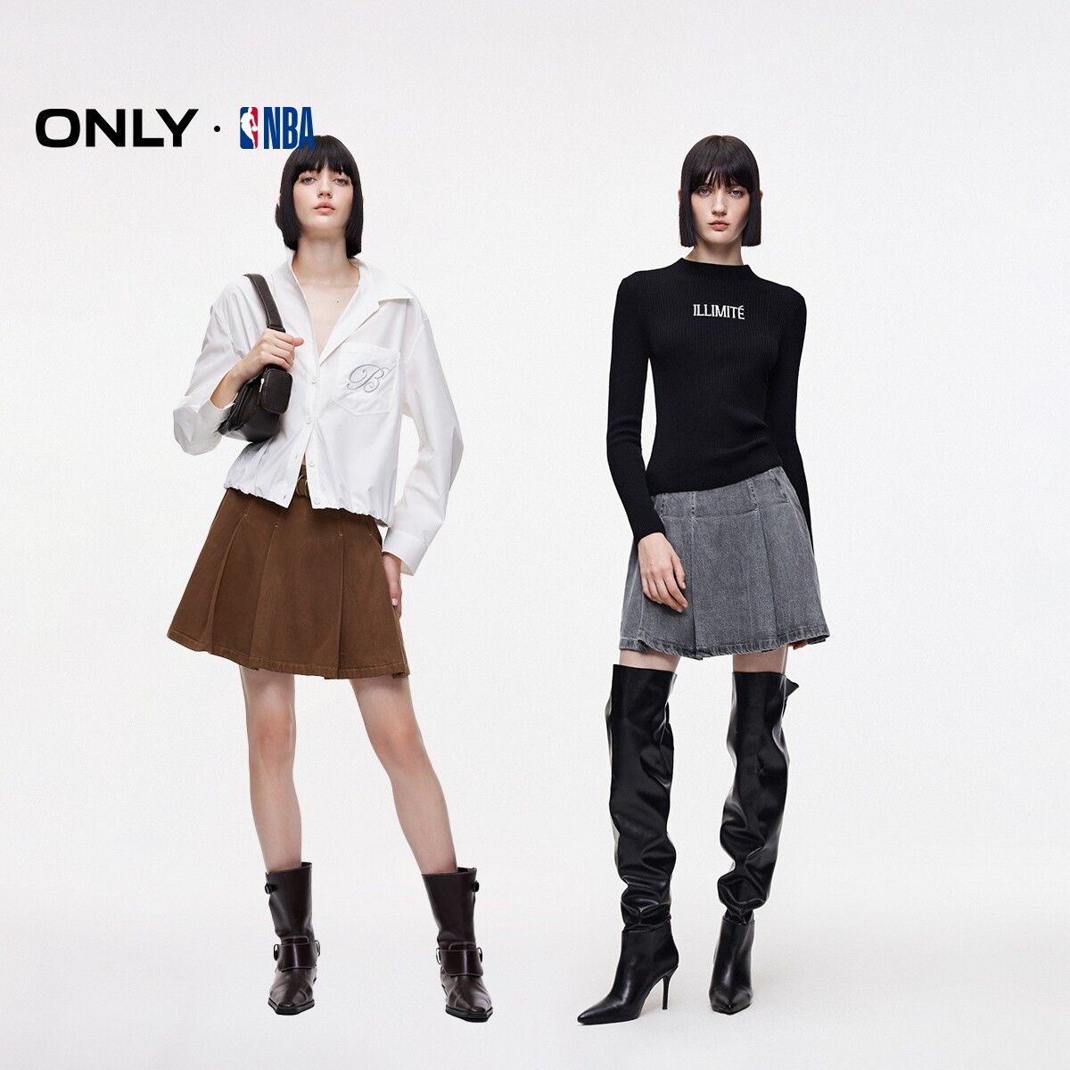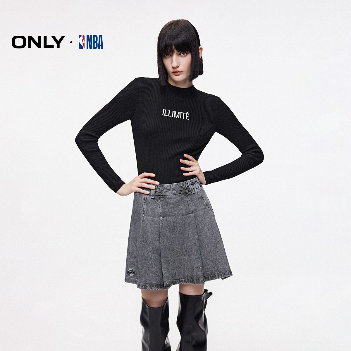 【ONLY奥莱】春款NBA联名款复古洗水满印皮牌A字牛仔短裙半身裙女